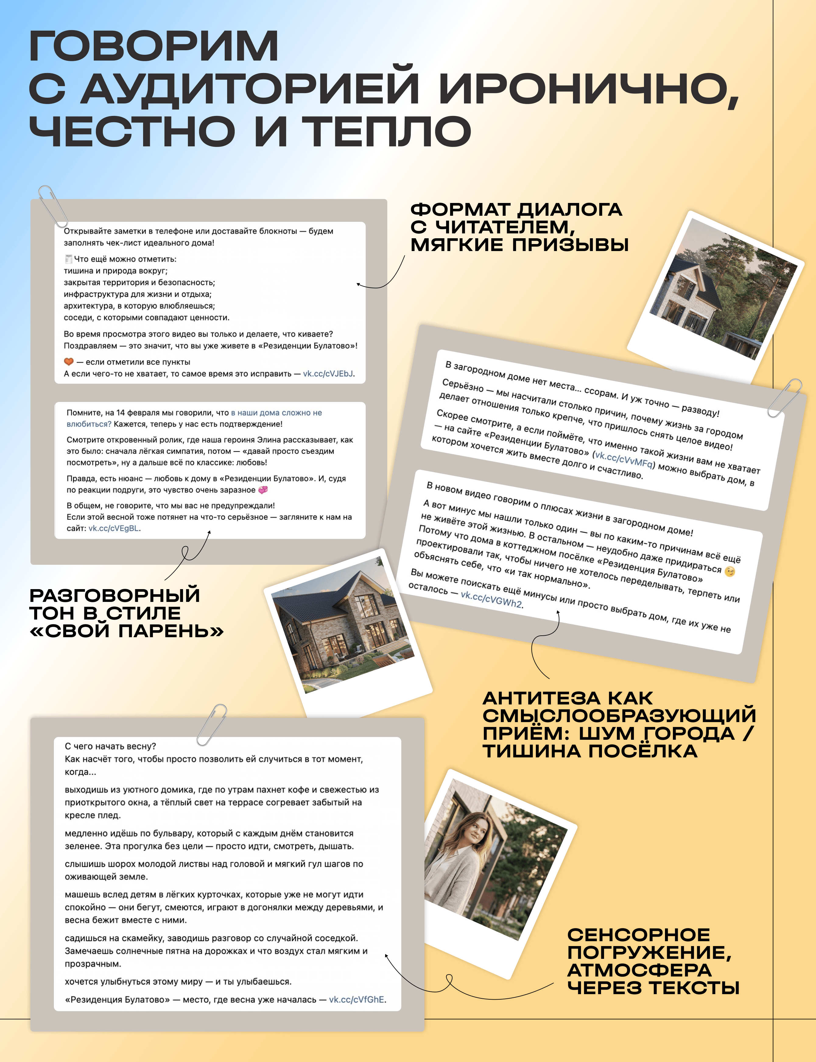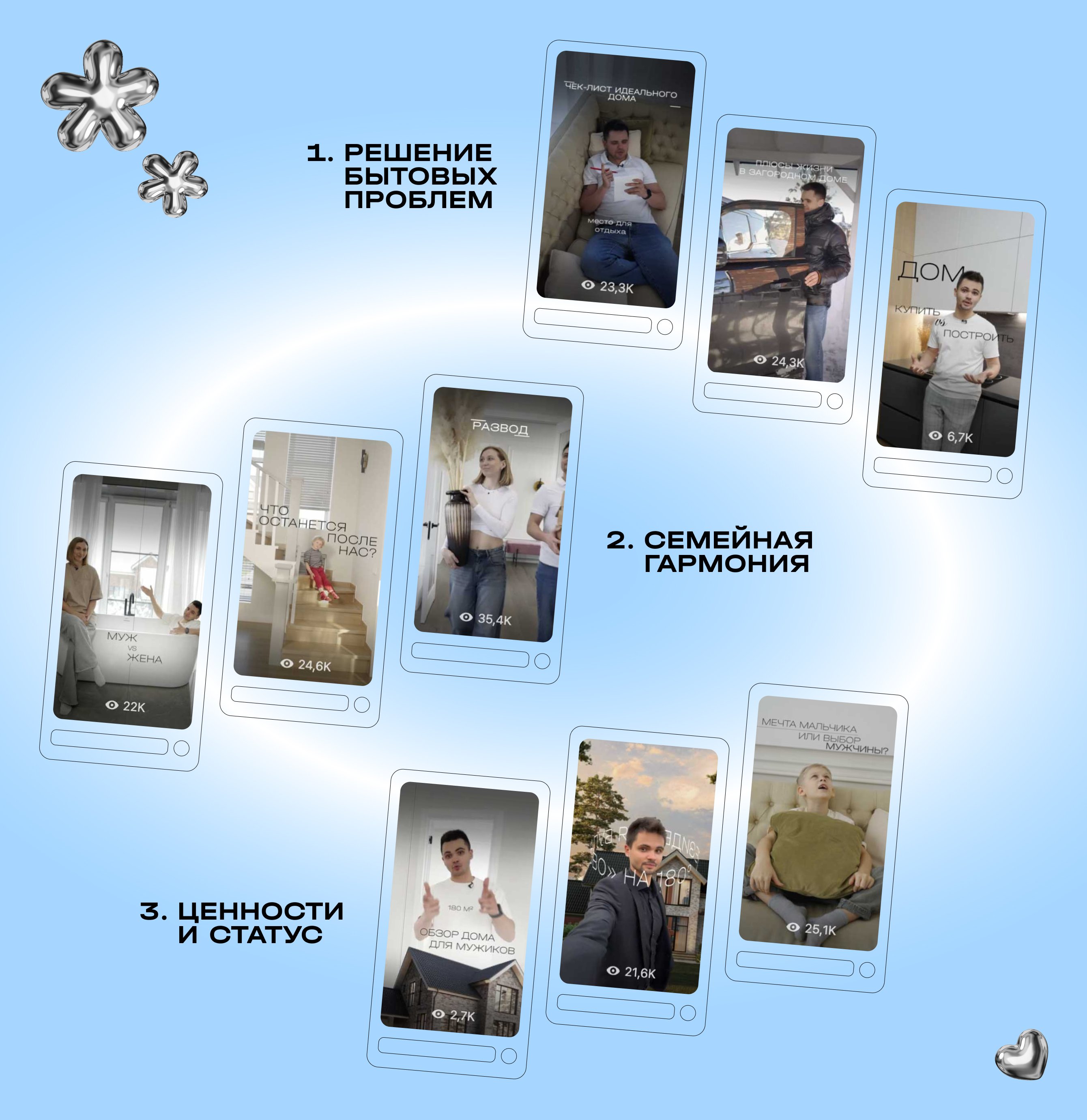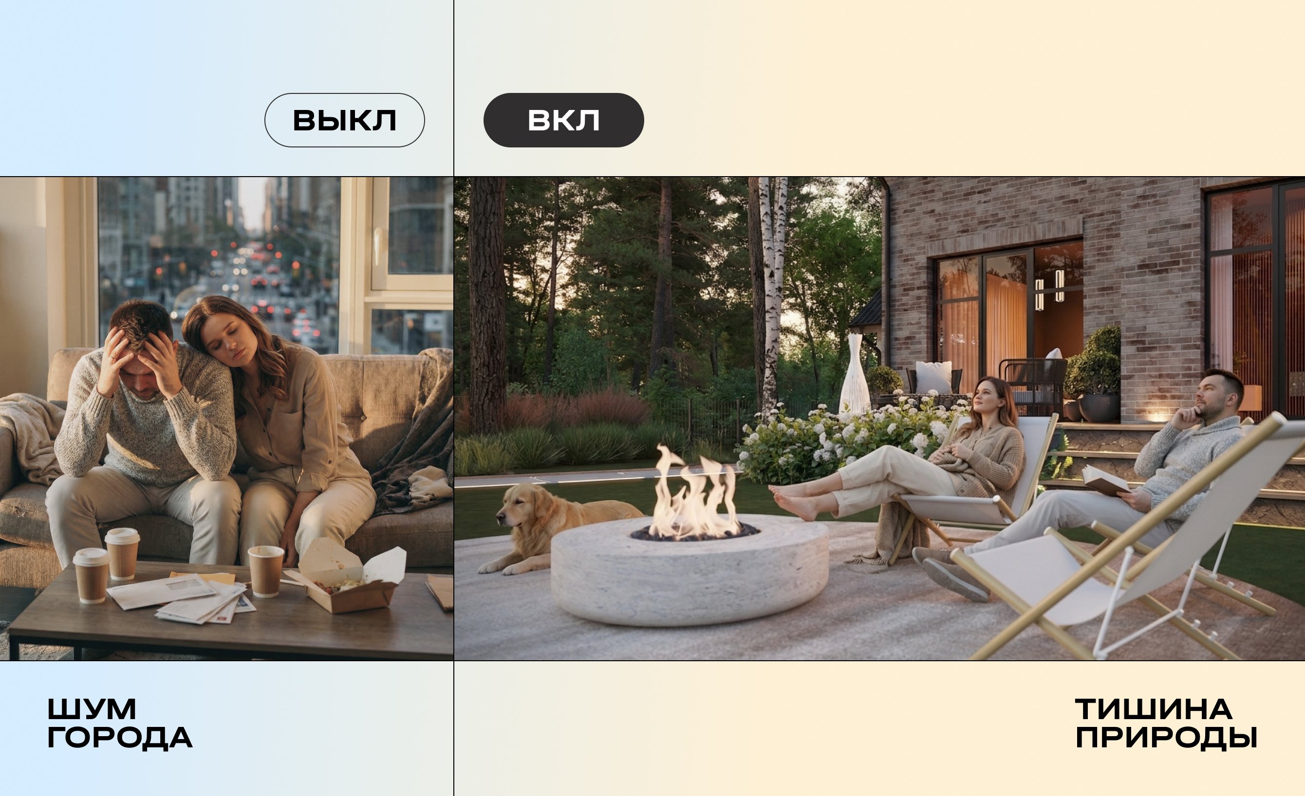 Глобально контент мы решили строить на столкновении двух миров: мира городских компромиссов с его теснотой, шумом, ссорами из-за парковки, отсутствием личного пространства — и мира загородных достоинств с тишиной, свободой и возможностью «разойтись по углам» (дословно из одного нашего завирусившегося ролика), чтобы сохранить семью.