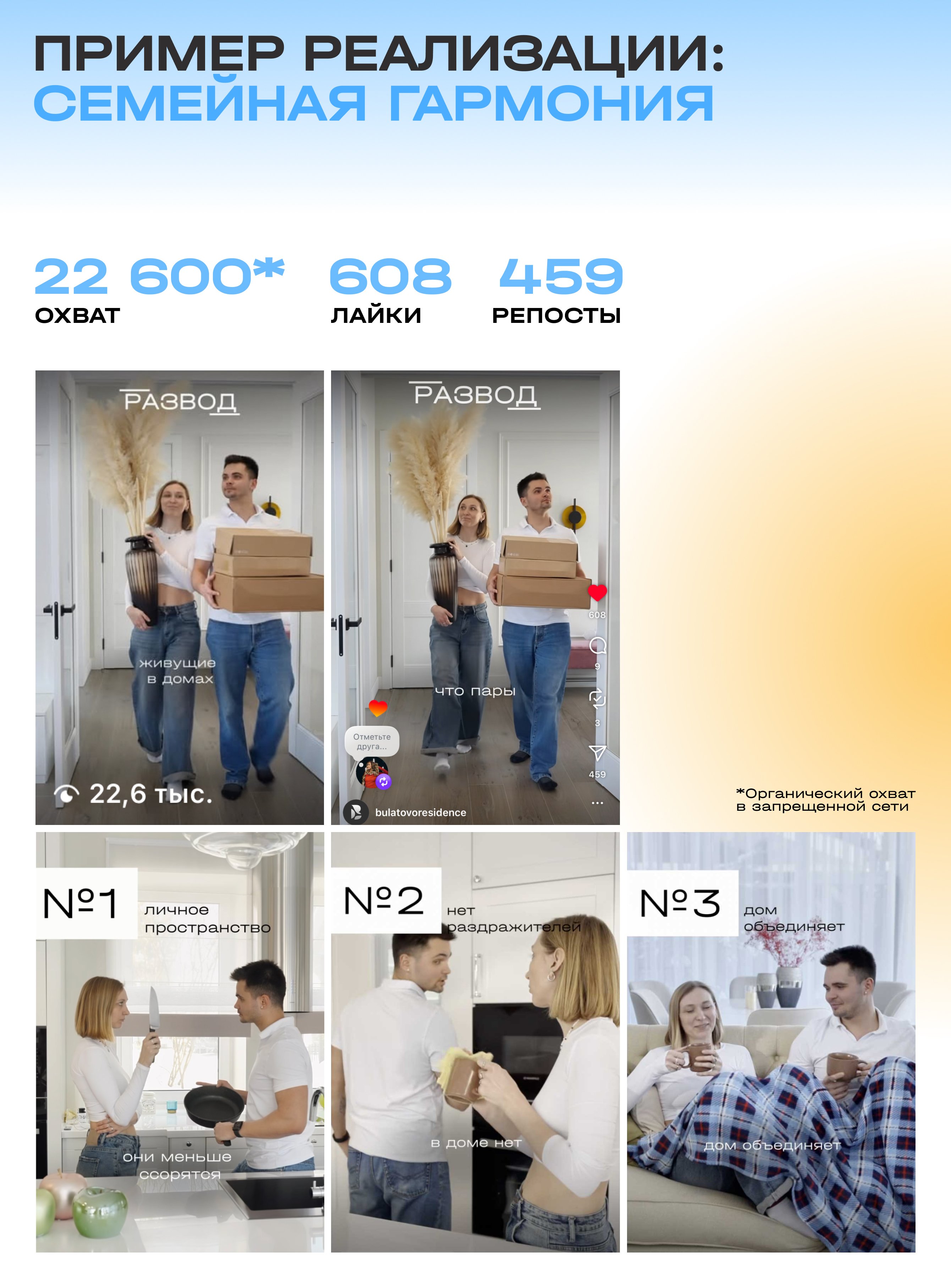 Видео про то, что пары разводятся реже, если живут в домах, набрало органически в запрещенной сети 22 600 просмотров, 608 лайков и 459 человек поделились этим постом либо у себя в сторис, либо в личном сообщении с близким человеком.
