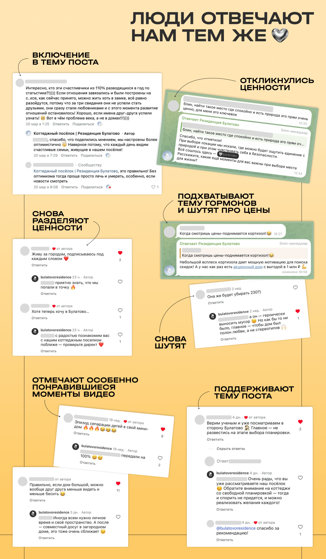 И мы с каждым днём уверяемся в правильности своей стратегии, потому что люди идут на диалог с «Резиденций Булатово». В комментариях они включаются в тему поста и откликаются на транслируемые ценности. А ещё они шутят. По-доброму и с лёгкостью.