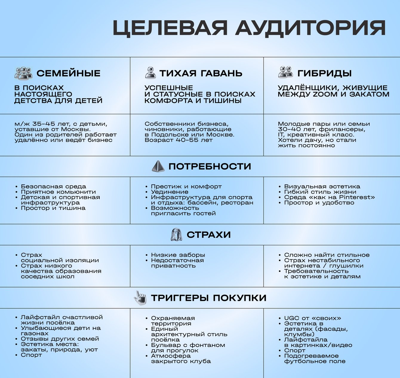 1. Сегмент первый: уставшие семейные москвичи, которым надоело толкаться в пробках столицы, стоять плечом к плечу с соседями в лифте и слушать по вечерам их семейные ссоры за картонной стеной, переживать, где и с кем гуляет ребенок.