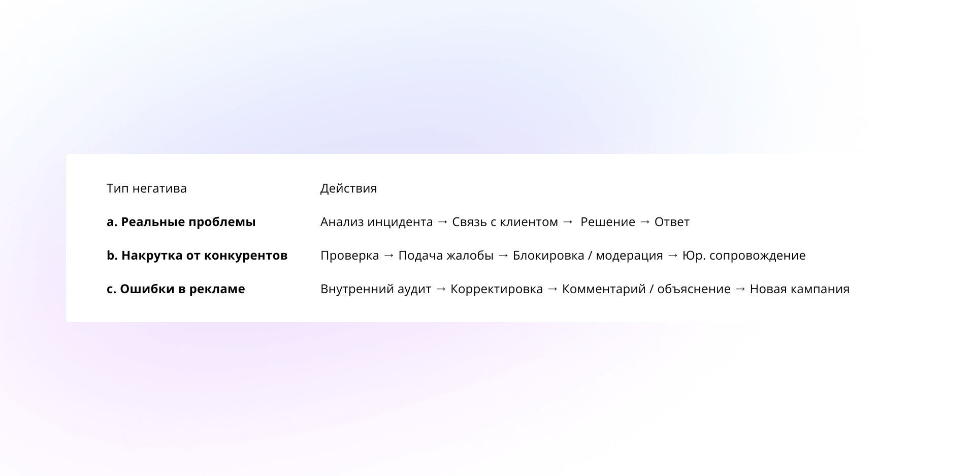 Параллельно мы организовали трёхуровневую систему отработки негатива — в зависимости от его источника и характера: