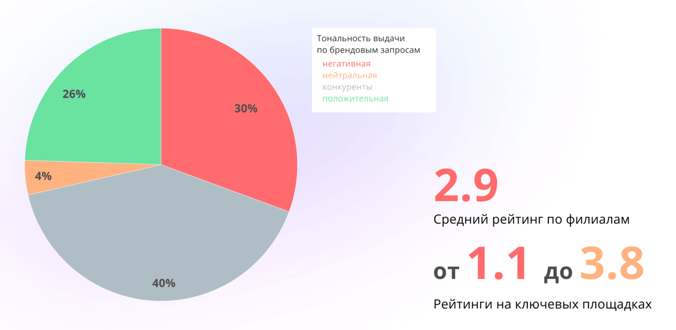Первое, с чего мы начали — это настройка ежедневного мониторинга упоминаний в поиске и на отзовиках. Мы сформировали список всех карточек компании во всех регионах присутствия. Объединили карточки в единую сеть для контроля и централизованного управления. Провели детальный анализ негативных триггеров и причин возникновения негатива. Причём не просто в целом, а с учётом региональной выдачи по всем 30 городам.
