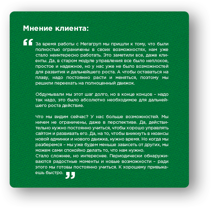 - Мегагрупп – специфичная CMS, работать с которой могут только ее собственные программисты, соответственно, все необходимые изменения вносятся достаточно долго и за отдельную плату;