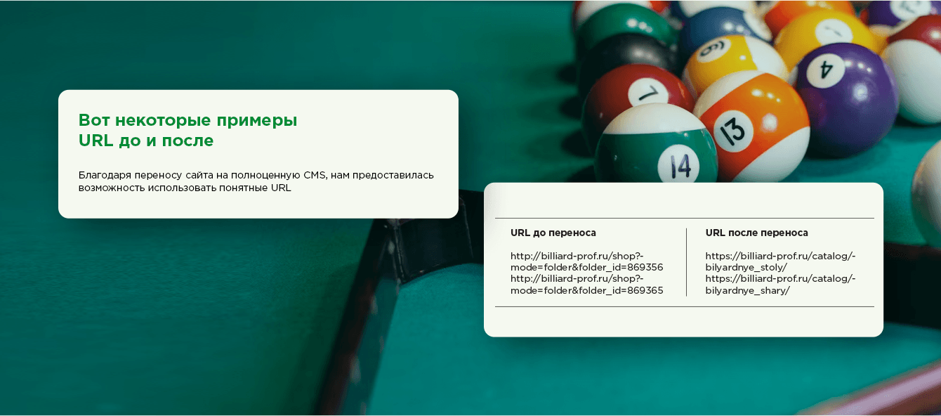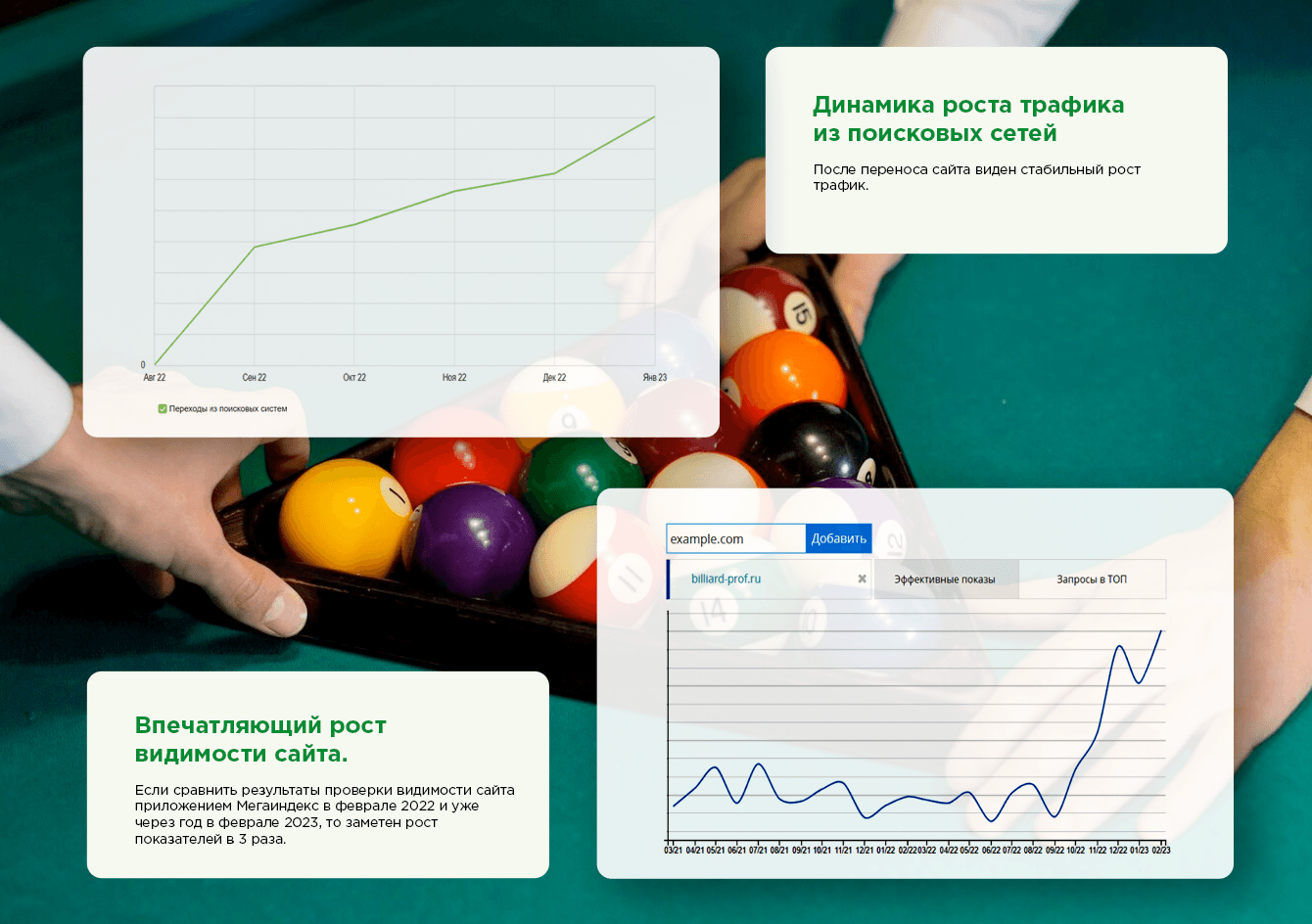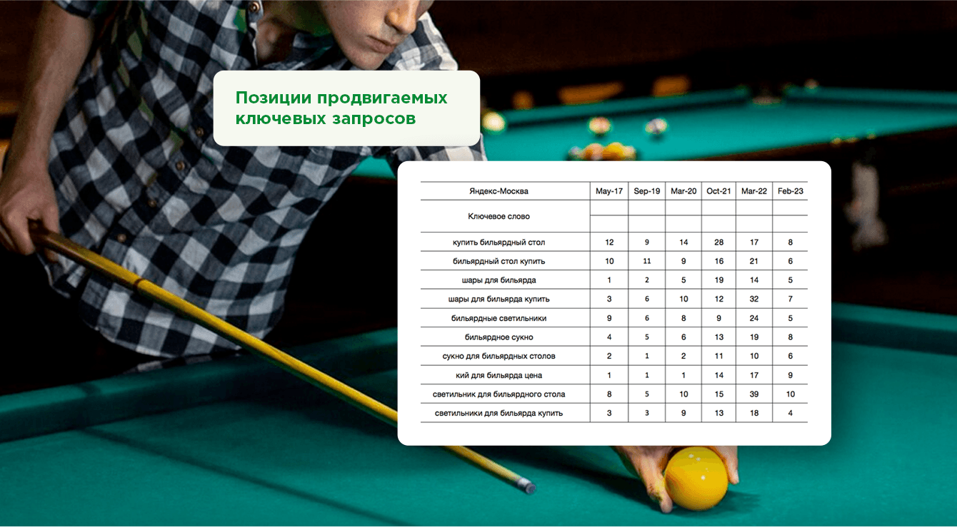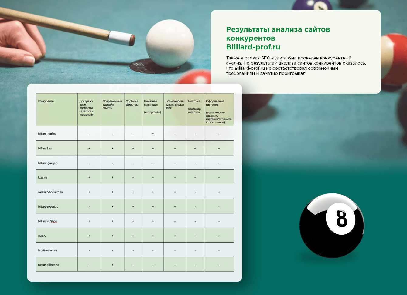 Также в рамках SEO-аудита был проведен конкурентный анализ. По результатам анализа сайтов конкурентов оказалось, что Billiard-prof.ru не соответствовал современным требованиям и заметно проигрывал.