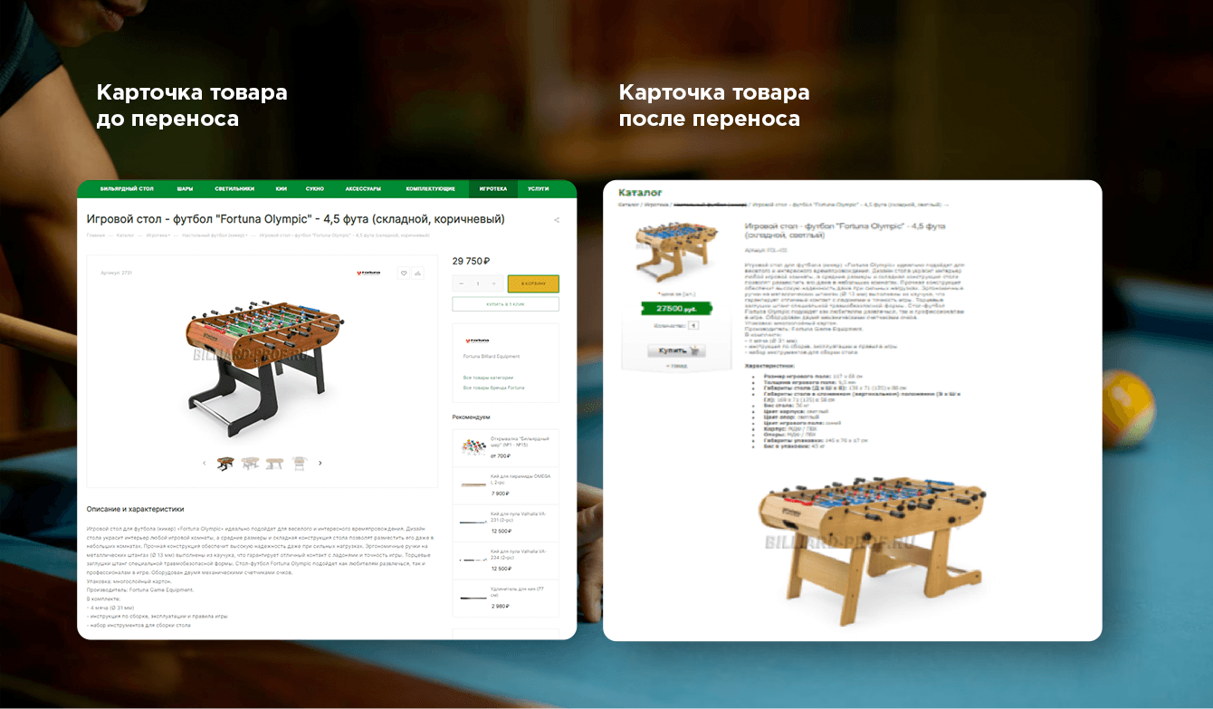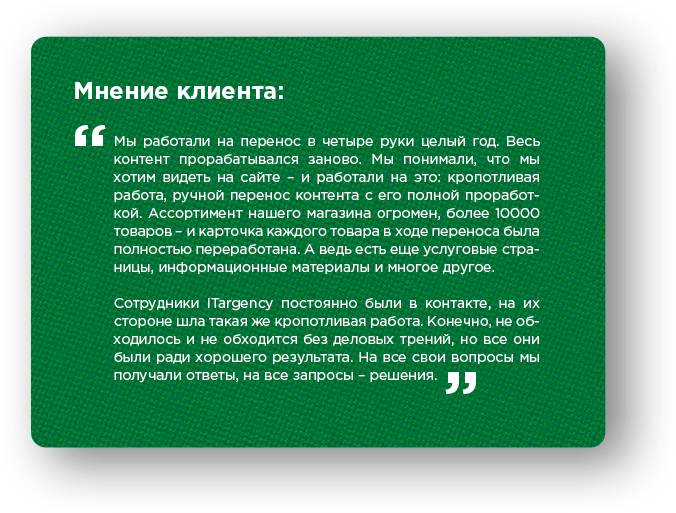 И то, на что потребовалось больше всего времени, – в ходе переноса огромная кропотливая работа шла на стороне клиента: тщательная подготовка изображений, переработка практически всех материалов, карточек товаров, характеристик и т.д.