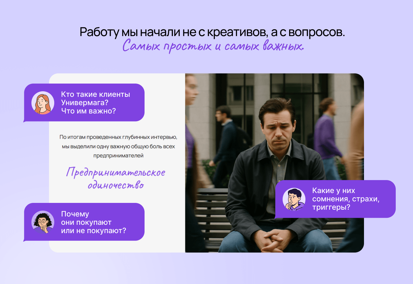 Работу мы начали не с креативов, а с вопросов. Самых простых и самых важных. Кто такие клиенты Универмага? Что им важно? Почему они покупают или не покупают? Какие у них сомнения, страхи, триггеры?