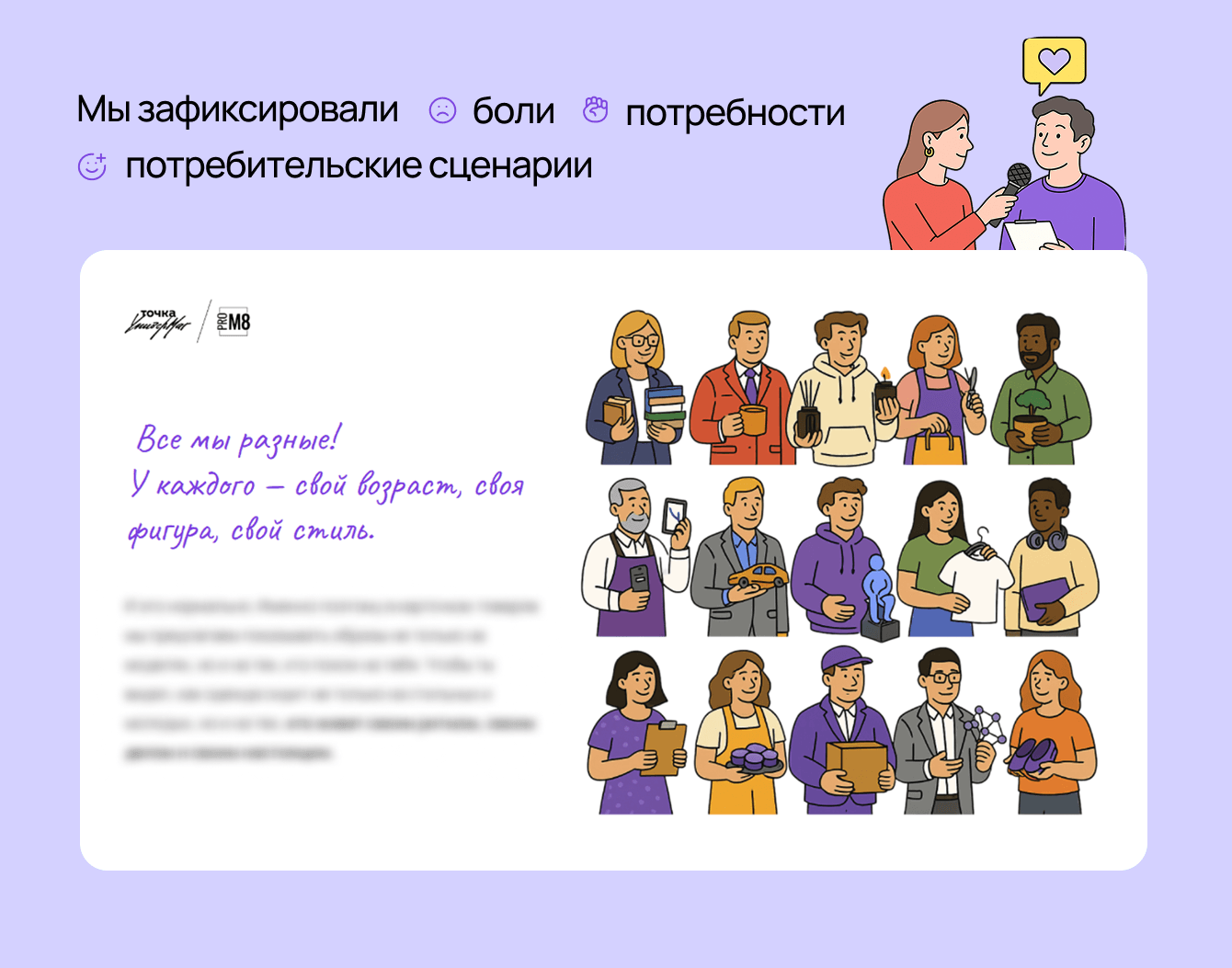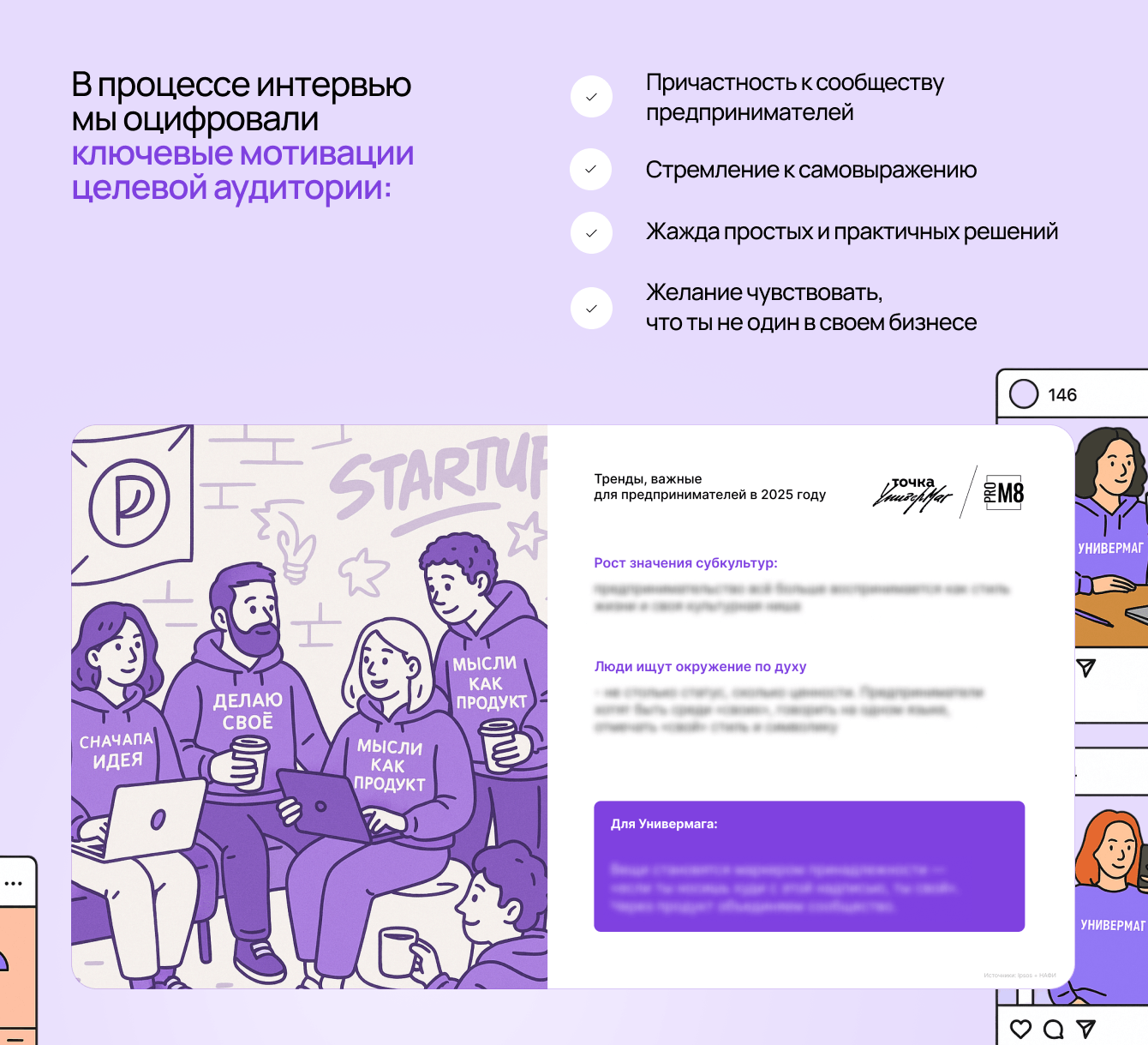 Работу мы начали не с креативов, а с вопросов. Самых простых и самых важных. Кто такие клиенты Универмага? Что им важно? Почему они покупают или не покупают? Какие у них сомнения, страхи, триггеры?