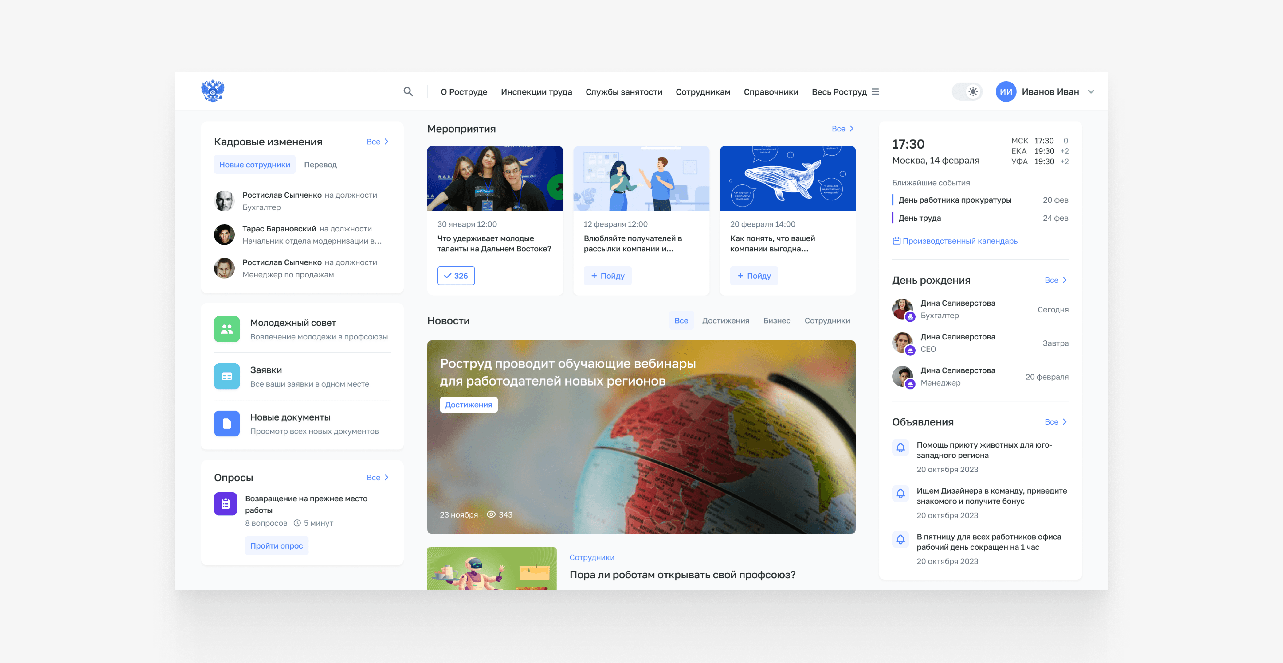 Разработали концепцию внутреннего портала сотрудника. Портал содержит всю необходимую информацию: новости, события, популярные разделы.