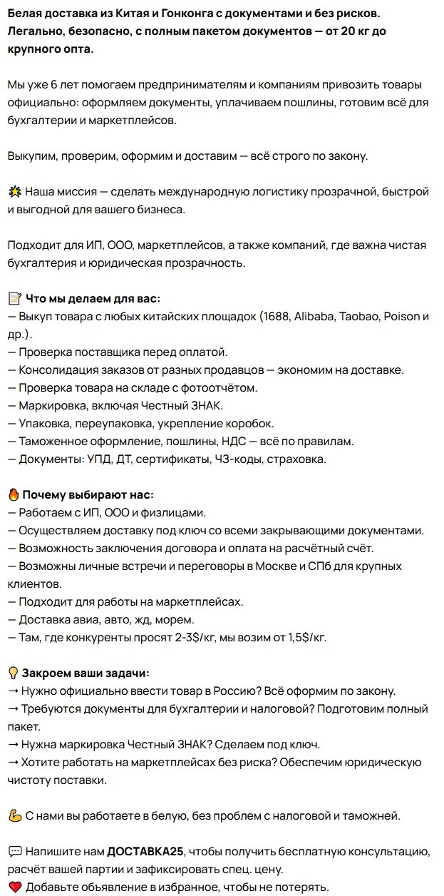 Каждый заголовок бьет в точку боли клиента: “Официальная белая доставка из Китая оптом”
