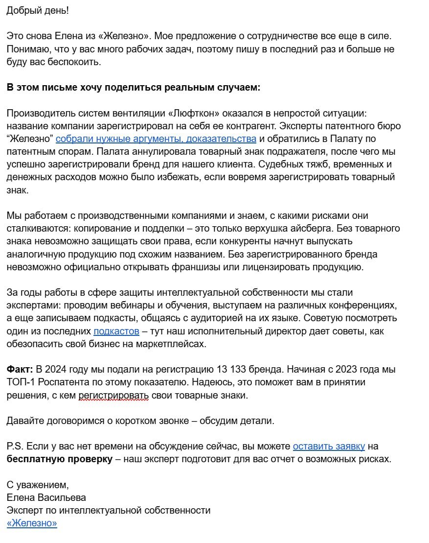 Бесплатная проверка товарного знака — предложенная в письме услуга бесплатной проверки сразу снизила барьер для отклика. Клиенты могли без риска узнать, можно ли зарегистрировать их знак, что значительно повысило отклик.