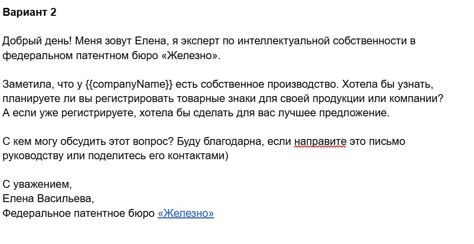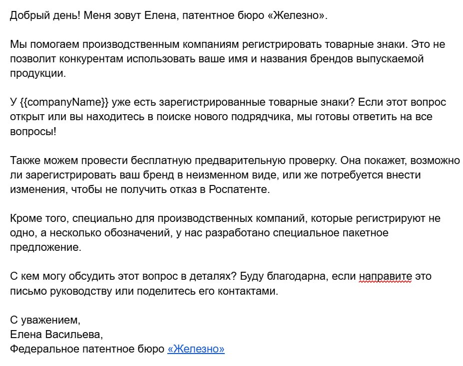 Бесплатная проверка товарного знака — предложенная в письме услуга бесплатной проверки сразу снизила барьер для отклика. Клиенты могли без риска узнать, можно ли зарегистрировать их знак, что значительно повысило отклик.