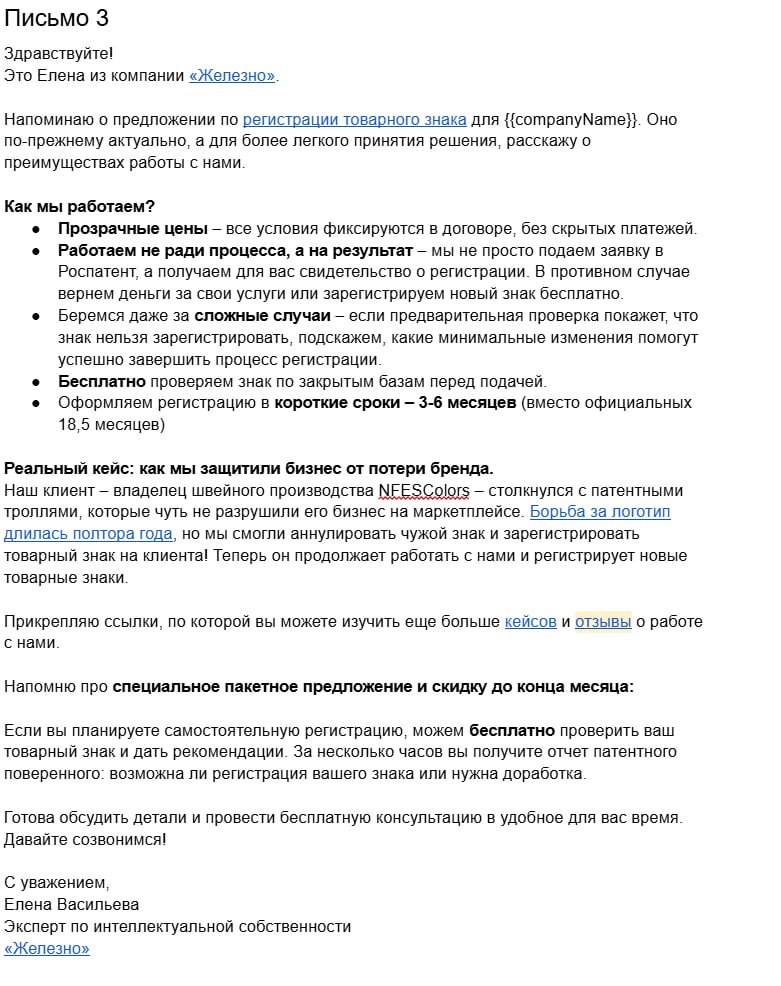 Социальное доказательство: В письмах мы добавили данные о том, что «Железно» — лидер Роспатента с 17 728 зарегистрированными товарными знаками и работающими с крупными брендами, такими как АК БАРС и Россельхозбанк. Это увеличивало доверие к бюро.