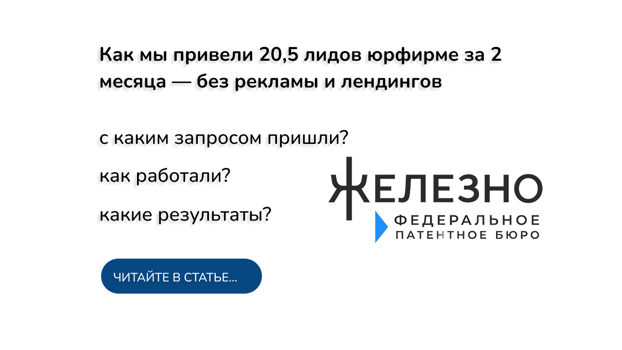 Так к нам обратилось Федеральное Патентное Бюро «Железно», лидеры по количеству поданных заявок на регистрацию товарных знаков в Роспатенте. Они знали, что их услуга нужна, но не могли найти способ донести это до нужной аудитории.