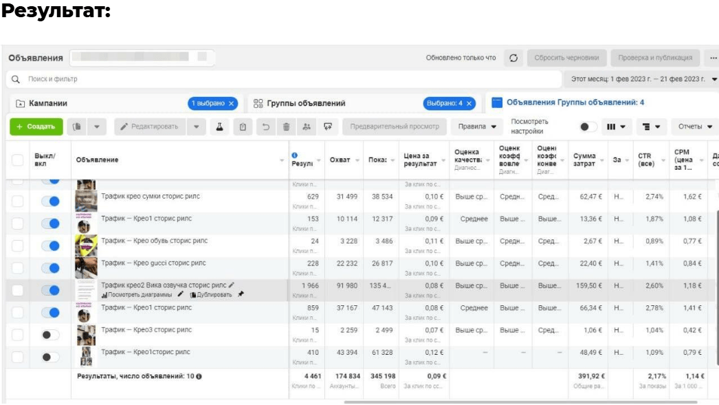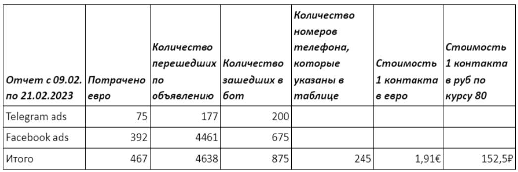 Здесь мы применили ту же схему с чат-ботом, но возможности таргетинга в Facebook* оказались несравнимо богаче. Мы протестировали несколько видеокреативов и настроили рекламу на look-a-like аудиторию, собранную из активных пользователей Instagram*-профиля клиента. А еще я напоминаю, что компания Meta (Facebook, Instagram) входит в список террористических организаций и запрещена в РФ. Оффером во всех кампаниях был депозит на 25 евро. Этот канал показал себя гораздо эффективнее, чем Telegram Ads, и никаких минусов мы не заметили. Параллельно мы также вели рекламу на профиль в Instagram* для набора подписчиков.