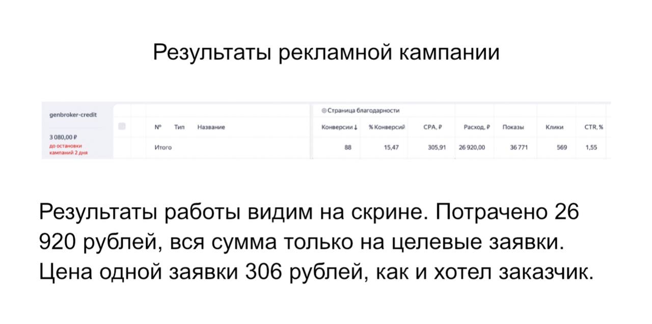 Запустили первые рекламные кампании в Яндекс Директ. За сутки работы рекламы мы получили 8 первых заявок. По 3 из которых дозвониться не удалось, остальные были целевые. Стоимость услуги заказчика от 150.000-300.000 рублей
