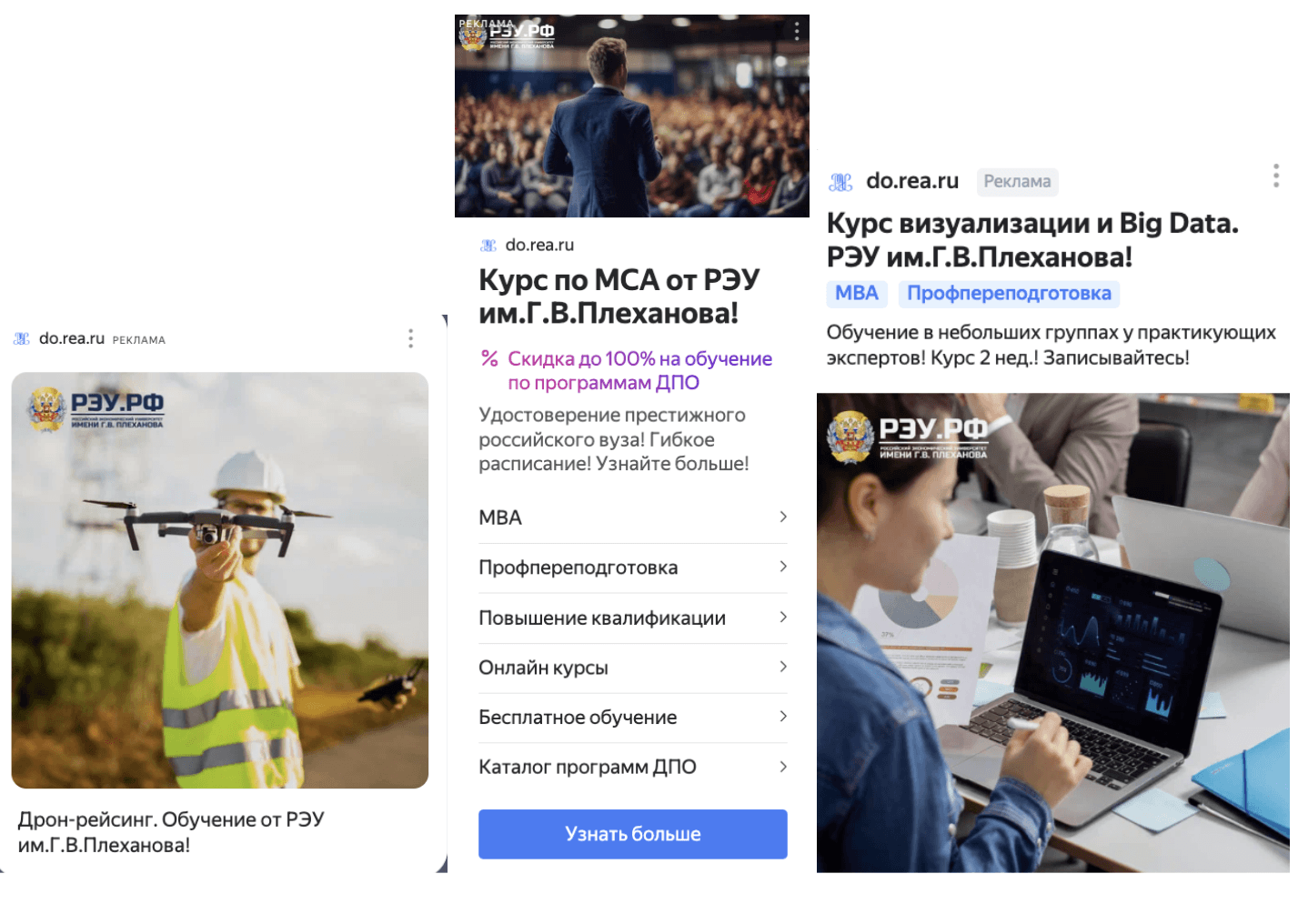 Перед запуском кампаний провели комплексный брифинг с клиентом, чтобы понять нюансы продукта и цели. Составили детальные портреты целевой аудитории, выделили приоритетные сегменты по направлениям обучения. Провели кабинетные исследования рынка, изучили конкурентов и их УТП, что позволило сформировать уникальные предложения для рекламных каналов РЭУ.