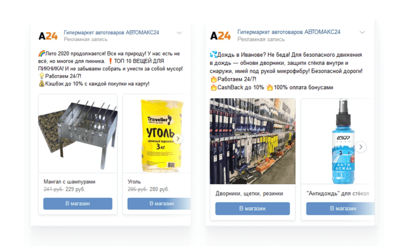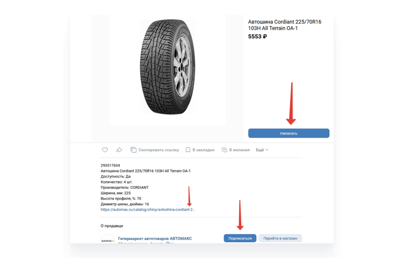 Настроили выгрузку товаров выбранных категорий в группу «ВКонтакте» с ежедневным обновлением. Для удобства в карточке предусмотрена ссылка на карточку товара на сайте, с необходимыми utm-метками, чтобы отследить эффективность.