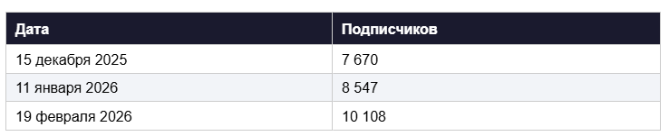 Рекламный трафик сделал своё дело — канал уверенно пошёл вверх. В середине декабря 2025 года в нём было 7 670 подписчиков. К 11 января их стало 8 547, а к 19 февраля канал перешагнул отметку в 10 000.