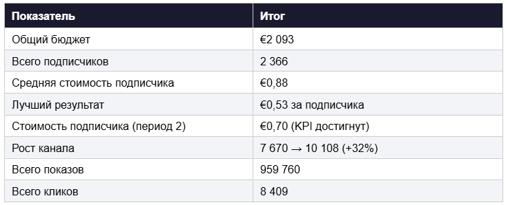 За два месяца мы потратили €2 093 и привлекли 2 366 подписчиков по средней цене €0,88. Целевой KPI в €0,70 достигнут во втором периоде. Лучший показатель по отдельным неделям составил €0,53 за подписчика. Канал вырос с ~7 600 до 10 108 подписчиков.