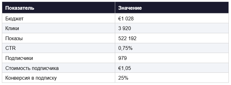 KPI с клиентом договорились на €1,00 за подписчика — в идеале €0,70. Цели казались амбициозными, учитывая специфику ниши и высокие ожидания клиента от качества аудитории.