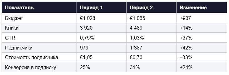 Комбинация трёх подходов дала результат. CTR вырос с 0,75% до 1,03% — на 37%. Конверсия в подписку поднялась с 25% до 31%. А стоимость подписчика упала с €1,05 до €0,70, что означало достижение целевого KPI.