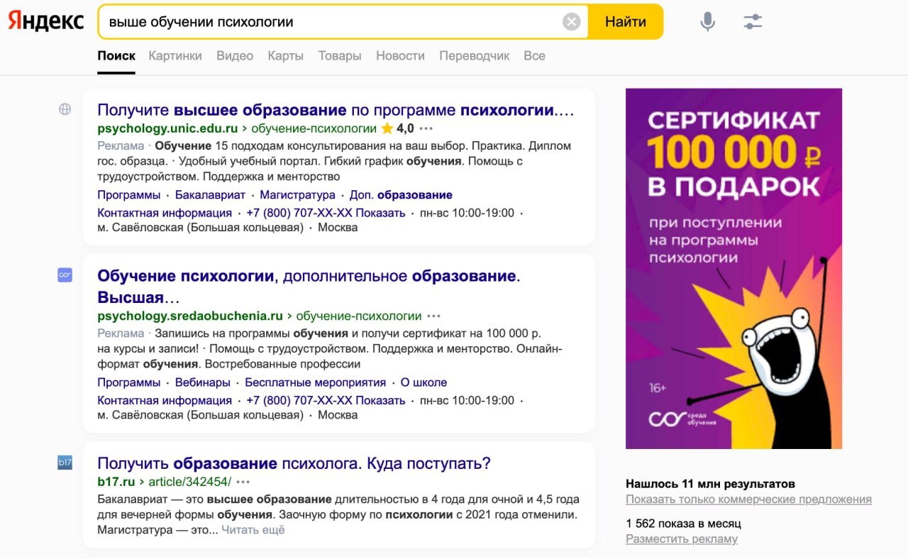 Психология (углубленные курсы) — 970 тыс. переходов, CPL — 11 100 руб.