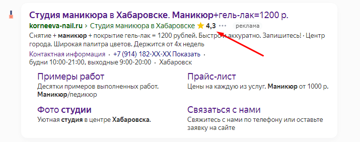 Так же было принято решение получить как можно больше отзывов на сервисах яндекса, это позволит учувствовать в рейтинге студий и иметь значок рейтинга в рекламном сниппете