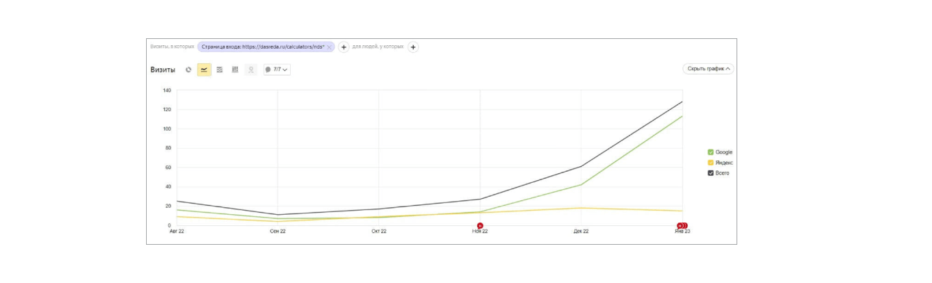 Калькулятор НДС, к примеру, пока не даёт значительную долю трафика в абсолютных цифрах, но динамика положительная: