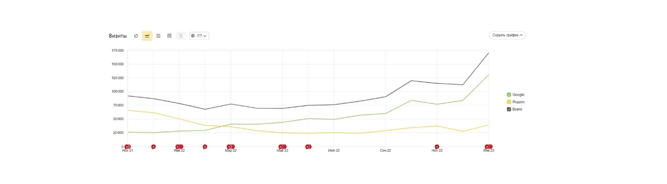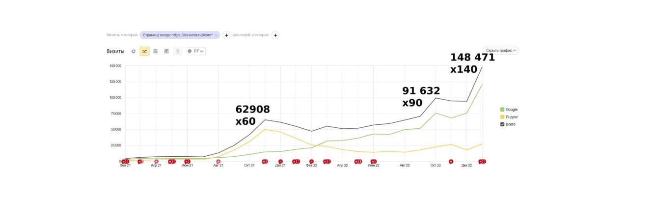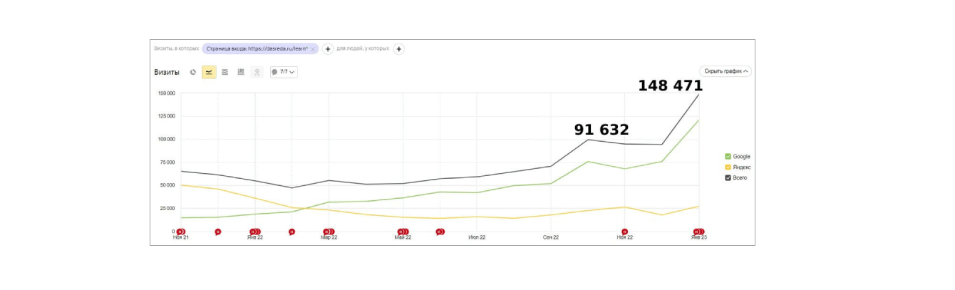 Отложенный эффект SEO в полной мере проявил себя к концу 2022 года и к началу 2023-го: в ноябре — 91 632 визита, а в январе — уже 148 471, и это несмотря на новогодние каникулы!