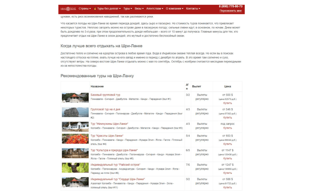 В статьях ставили коммерческие блоки на релевантные туры. Например, в статье про погоду на Шри-Ланке читатели видели блок с турами на Шри-Ланку.