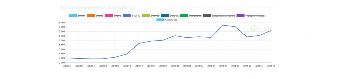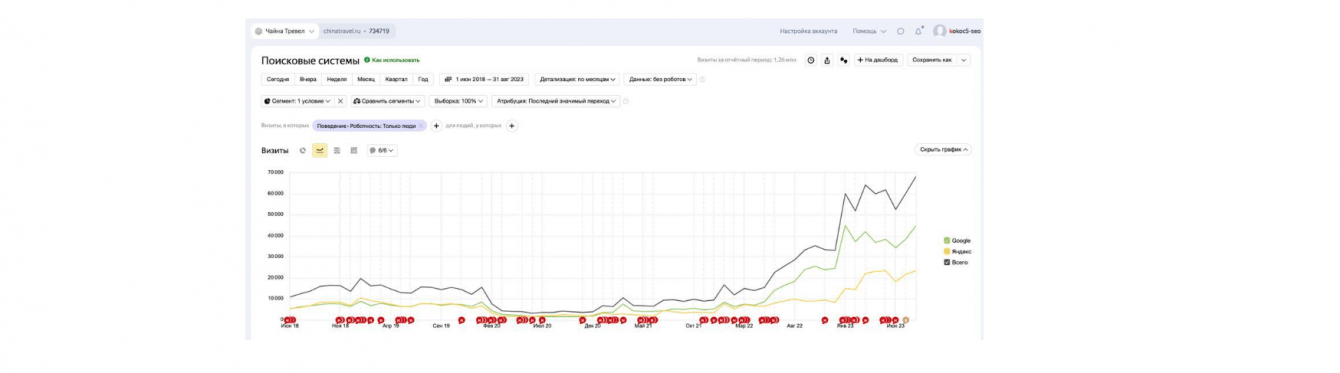 В 2023 году Китай наконец-то стал доступен для туризма. За это время видимость по запросам, связанным с Китаем, мы не потеряли, что сразу же дало большой прирост трафика.