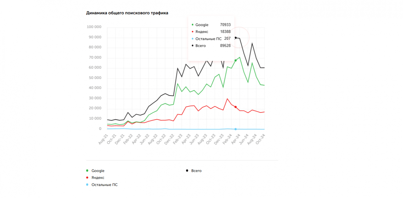 Рассмотрим период с августа 2021 года по октябрь 2024 года для сайта в целом и для блога — он оказал существенное влияние на результаты!