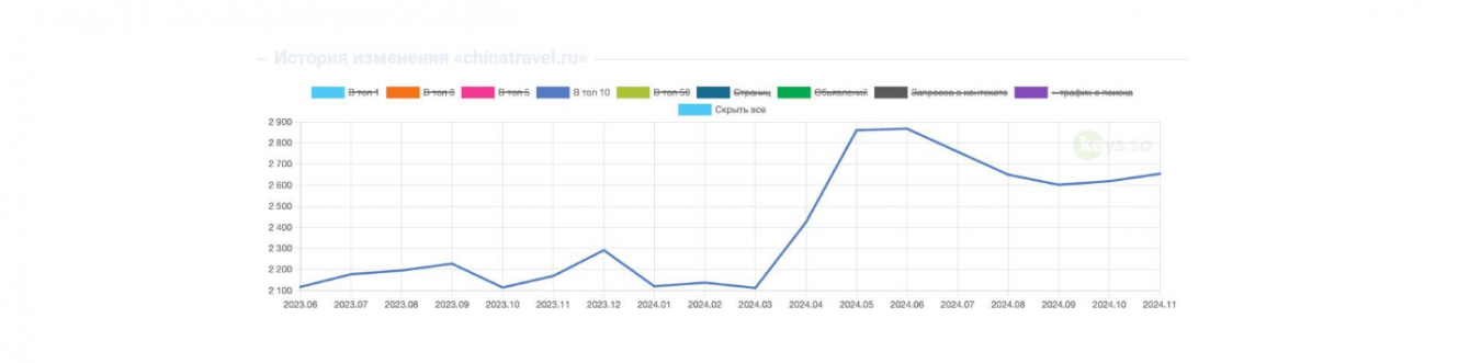 В топ-10 Google вышло 7106 запросов, в том числе “туры в китай”, “тур в китай”, “виза в китай для россиян в 2024”, “диснейленд шанхай”, “хайнань туры”, “туры в японию”, “туры в китай из москвы 2024”, “шри ланка погода”, “туры в китай из москвы” и др.
