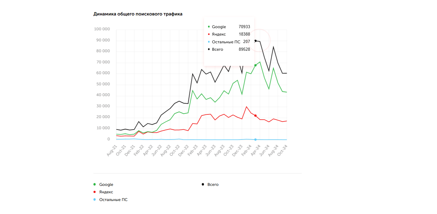 Посмотрите динамику общего трафика с 2018 по 2024 гг. мы видим стабильность в 2018, падение в 2020 из-за пандемии и резкий рост в начале 2023: