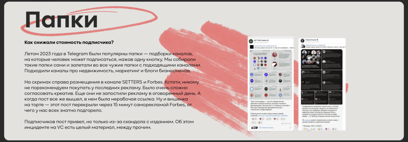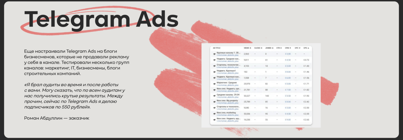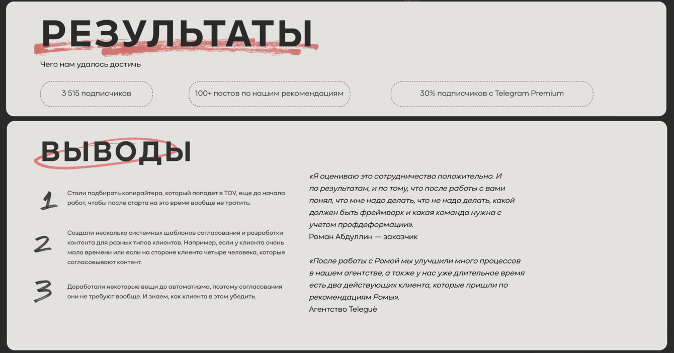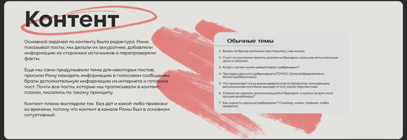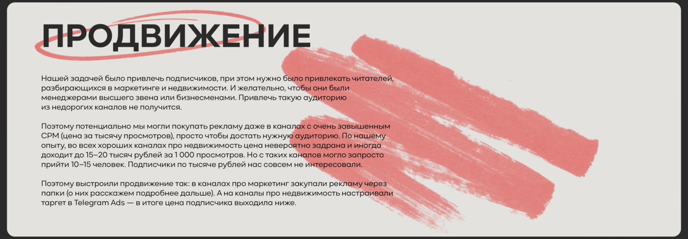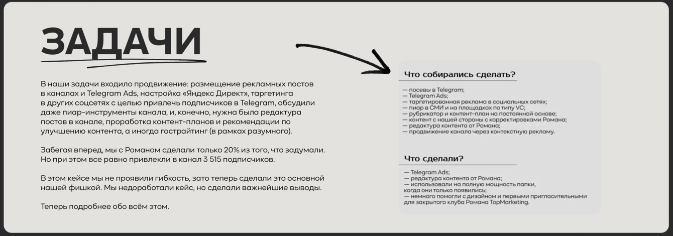 В наши задачи входило продвижение: размещение рекламных постов в каналах и Telegram Ads, настройка «Яндекс Директ», таргетинга в других соцсетях с целью привлечь подписчиков в Telegram, обсудили даже пиар-инструменты канала, и, конечно, нужна была редактура постов в канале, проработка контент-планов и рекомендации по улучшению контента, а иногда гострайтинг (в рамках разумного).