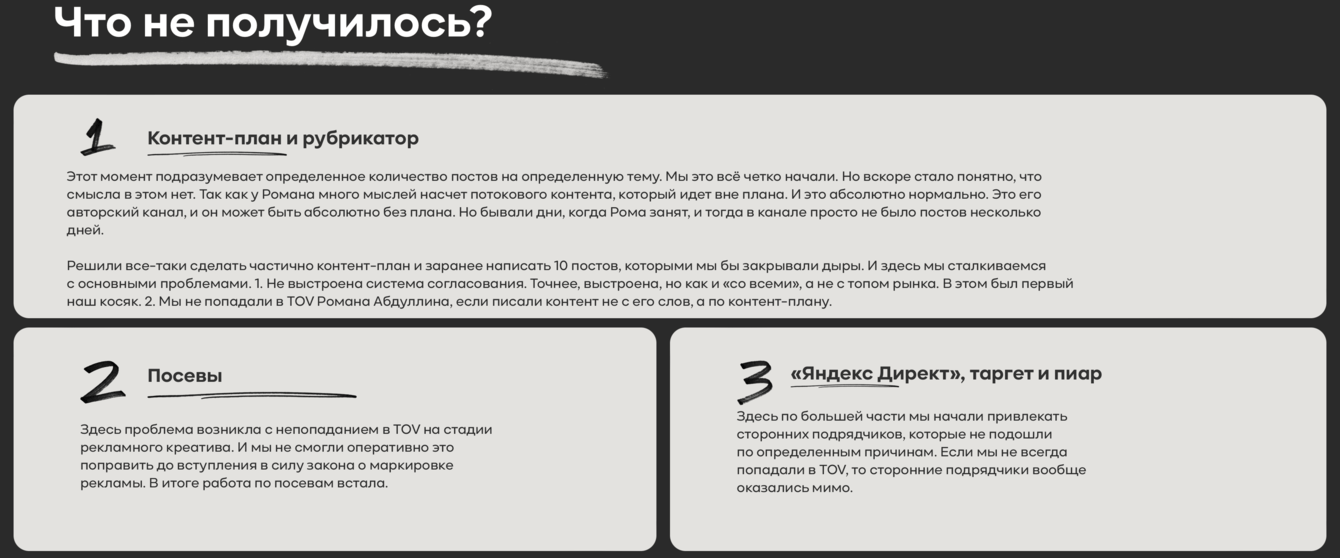 Забегая вперед, мы с Романом сделали только 20% из того, что задумали. Но при этом все равно привлекли в канал 3 515 подписчиков. В этом кейсе мы не проявили гибкость, зато теперь сделали это основной нашей фишкой. Мы недоработали кейс, но сделали важнейшие выводы. Теперь подробнее обо всём этом.