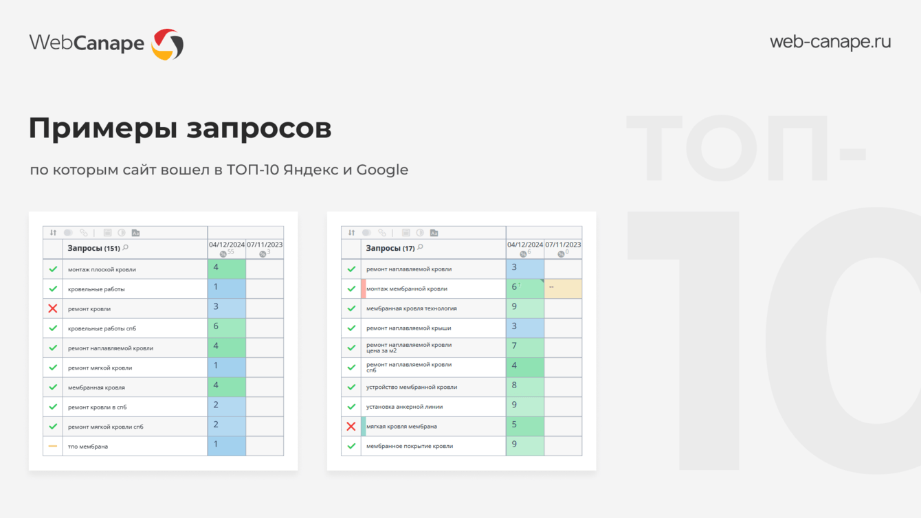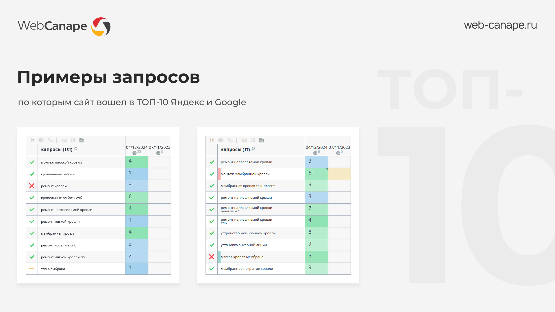 А по многим приоритетным для бизнеса и частотным запросам, например, «монтаж плоской кровли», «монтаж кровли в Санкт-Петербурге» или «ремонт наплавляемой кровли СПб» сайт клиента занял позиции в ТОП-10 Яндекса и Google.
