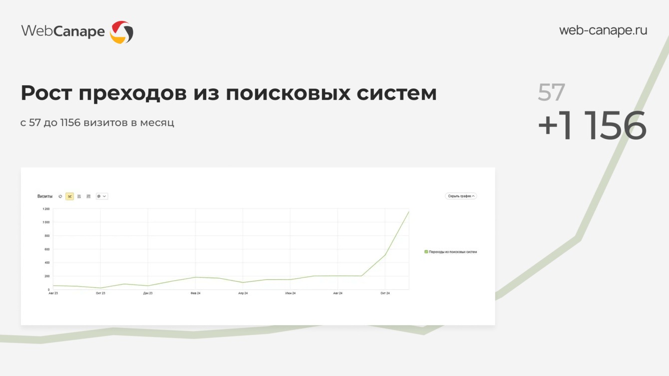 В результате количество переходов из поисковиков увеличилось с 57 до 1 156 визитов в месяц.