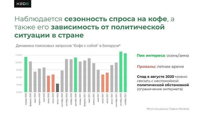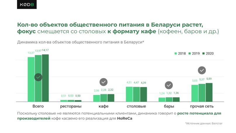 Соотношение экспорта и импорта Беларуси показало, что, выходя на этот рынок, российским производителям кофе придется конкурировать и со своими соотечественниками. Однако конкуренты есть и внутри страны. Некоторые из них даже реализуют производимый кофе в собственных кофейнях. Создают брендированный кофе и подарочные наборы для корпоративных клиентов. На что мы также обратили внимание заказчика.