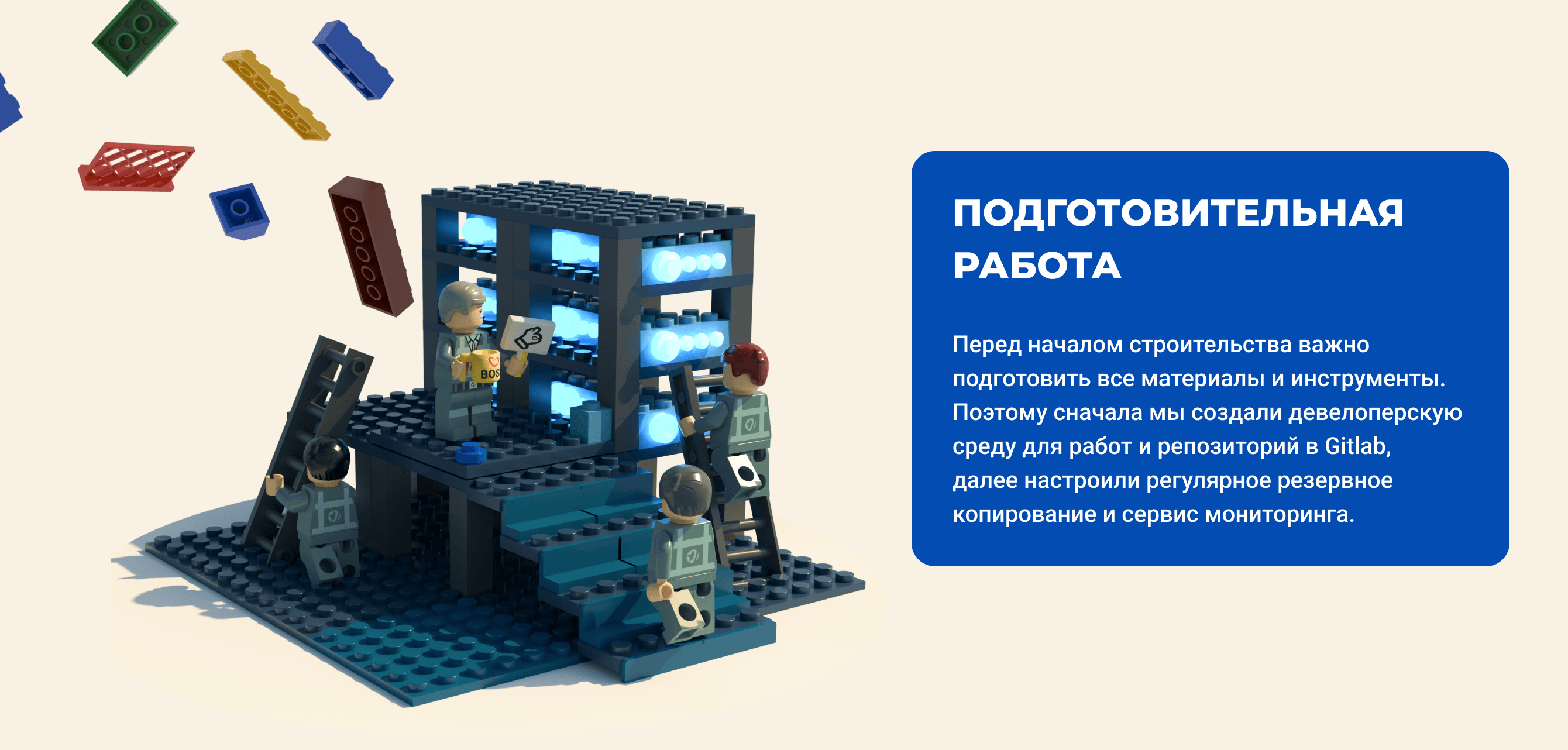 Перед началом строительства важно подготовить все материалы и инструменты. Поэтому сначала мы создали девелоперскую среду для работ и репозиторий в Gitlab. Это позволяет обеспечивать стабильную работу основного сайта и одновременно работать нескольким командам над проектом.