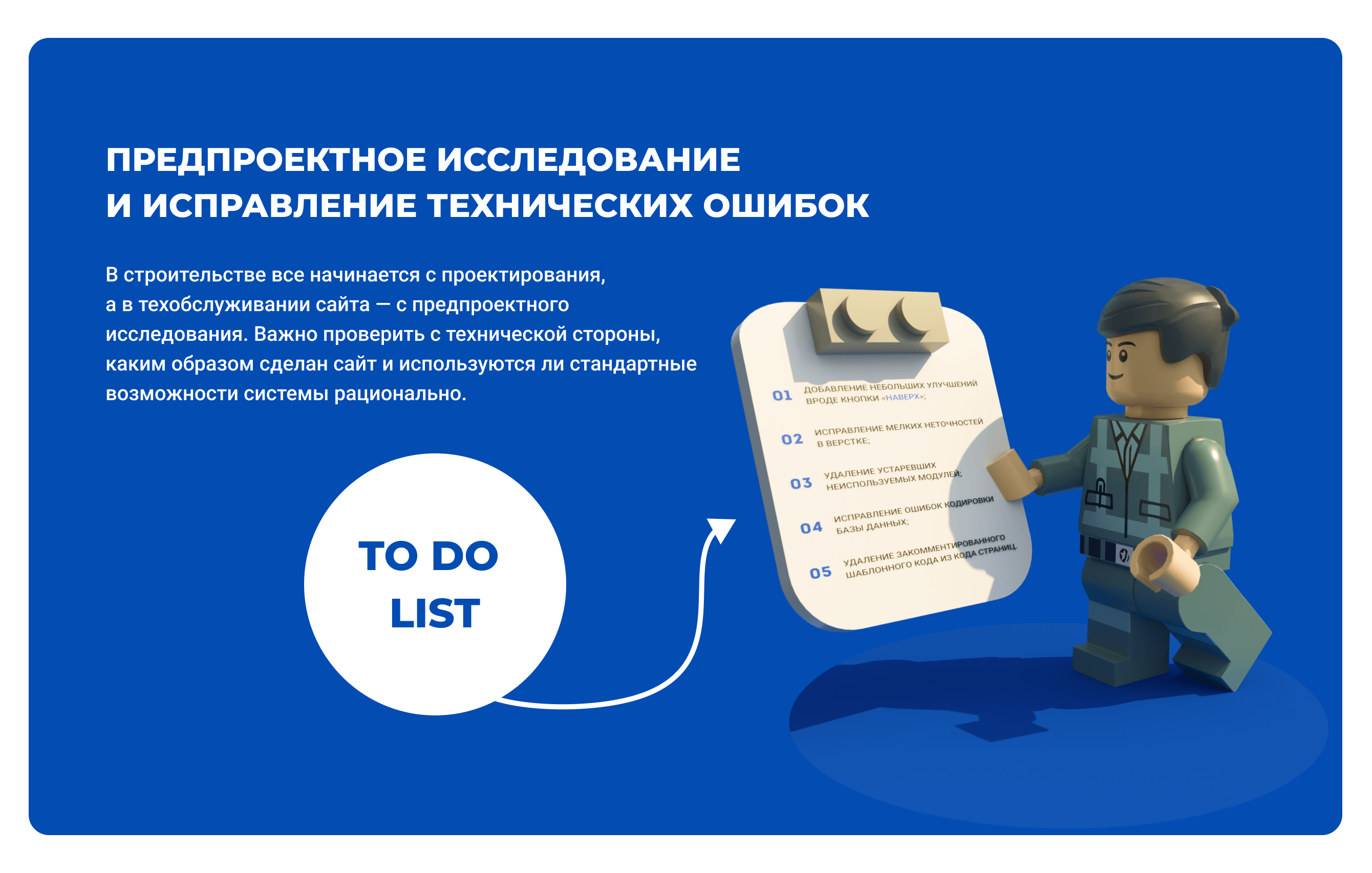 Таким образом, мы составили общий реестр задач и дали список рекомендаций для внедрения. Затем программист и проект-менеджер расставили для задач приоритеты. Наиболее важные пункты, например неработающая форма «Заказать звонок» в шапке, с большей вероятностью попадали в перечень работ на ближайший период.
