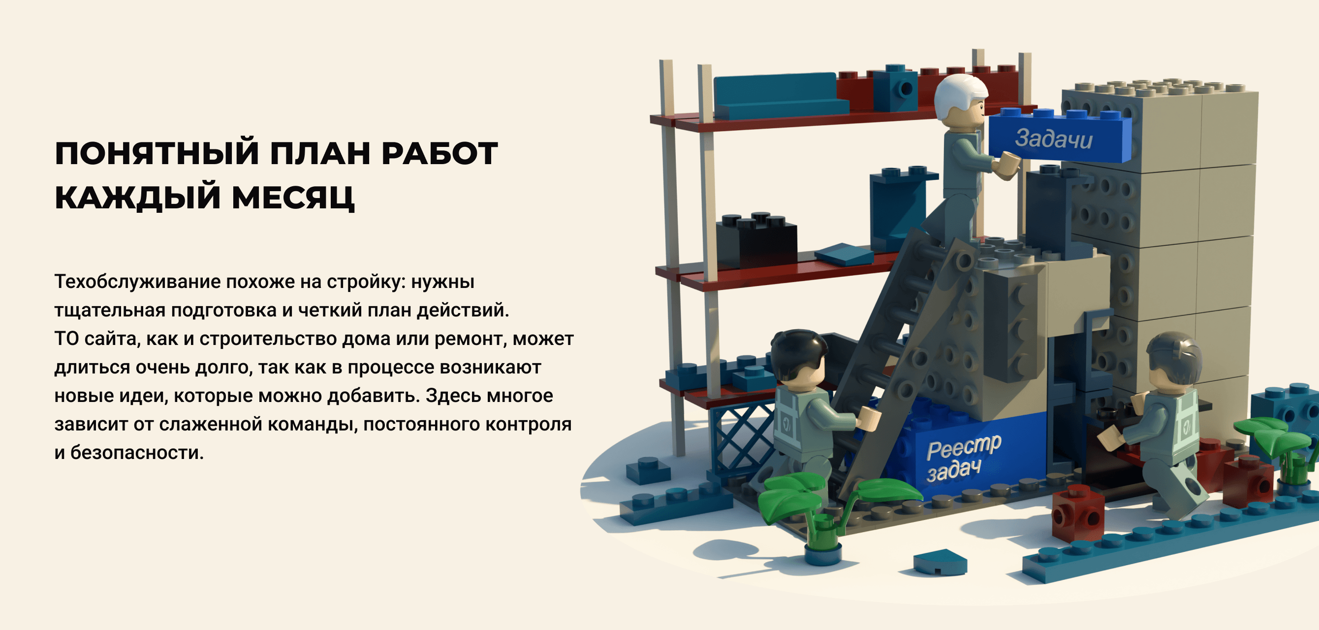 Мнения разделились: у команды клиента было желание сделать сайт красивым, а мы настаивали на том, что в такой тематике важны функциональность и удобство пользования. Анализ конкурентов подтвердил нашу теорию. В таком случае было оптимально предложить услугу технического обслуживания.