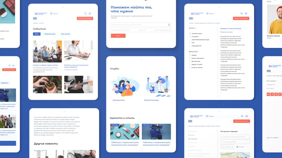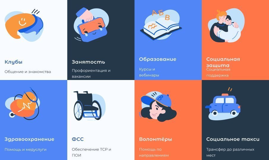 Ключевым элементом стали иллюстрации, которые используются как обложки для отдельных блоков, так и просто как фоновые рисунки. Для нас было важным показать на сайте каждого, кто столкнулся с инвалидностью, сделать это максимально этично и современно.
