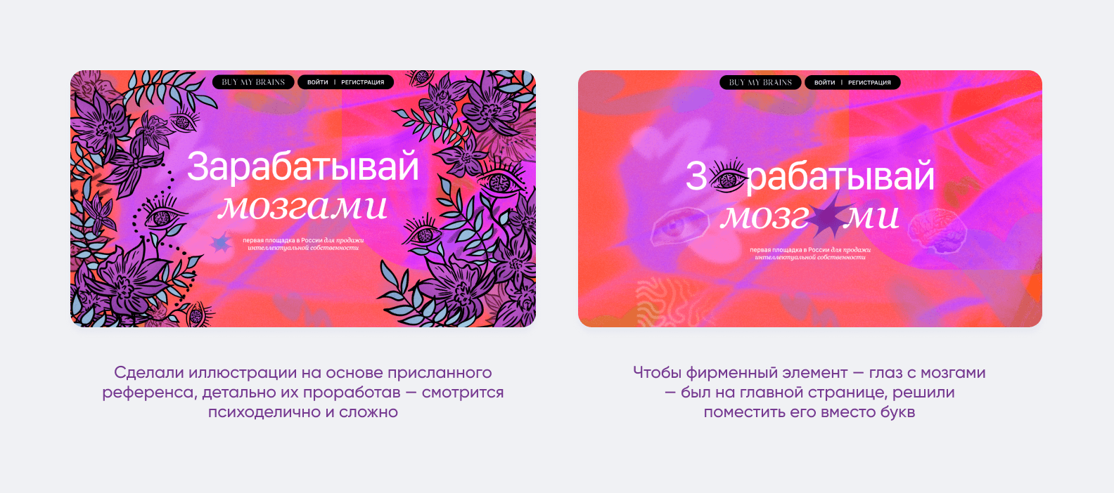 В дизайне главного экрана использовали референс — тот самый глаз с мозгом вместо зрачка.