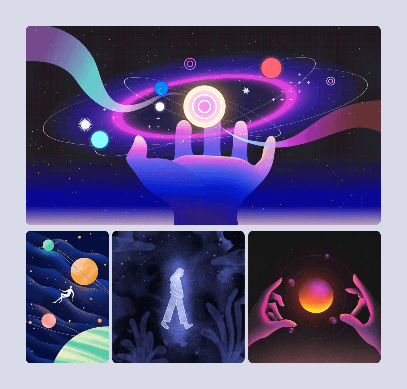 У заказчицы были референсы и некоторые наработки по визуальной составляющей и эстетике, которые ей хотелось отразить в дизайне платформы. Яркие цвета, немного хипповское настроение и порция психоделики в духе 60-х годов. А нам оставалось только придумать, как из картинок и описания сделать готовый продукт.