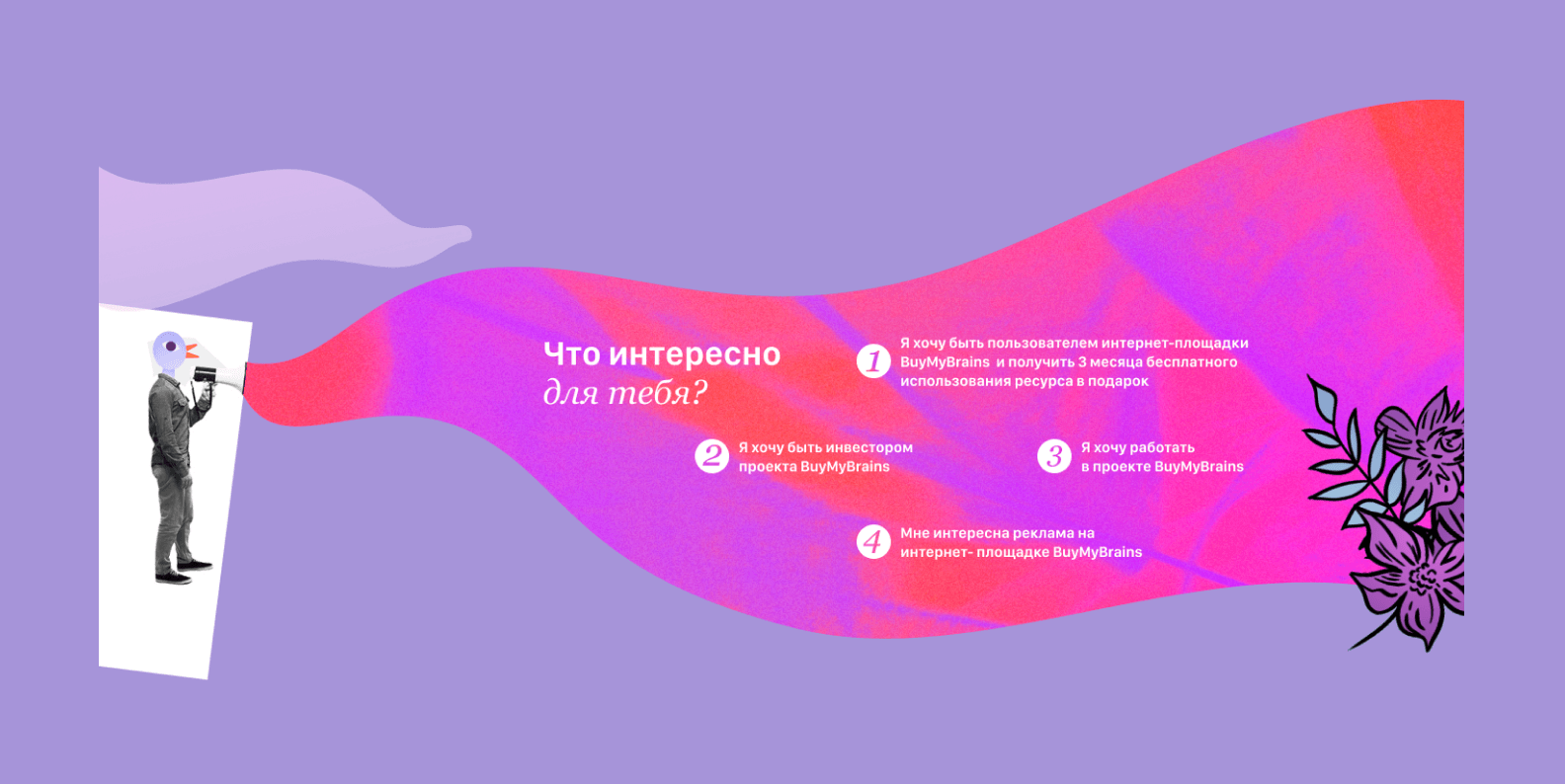Кстати, о герое. Как вам этот человек-гусь? Персонажа придумала наш графический дизайнер, и заказчица осталась от него в полном восторге — он идеально вписывался в эстетику Buy my brains. Использовали его и для дизайна страницы о платформе.