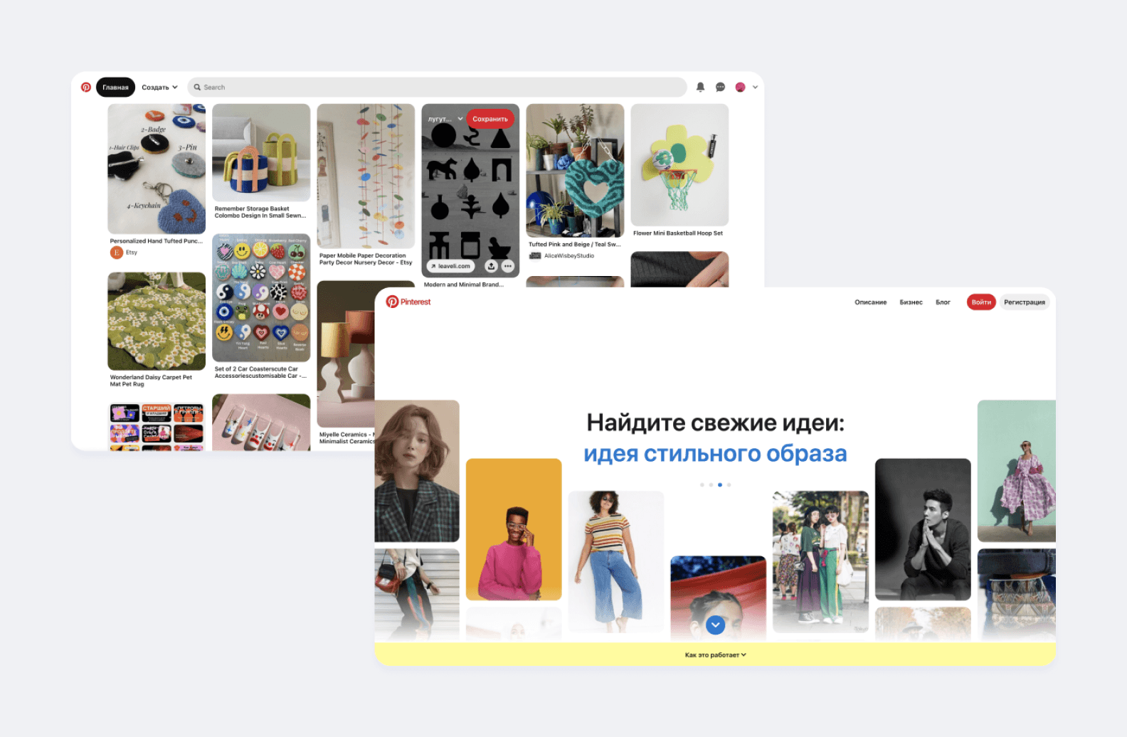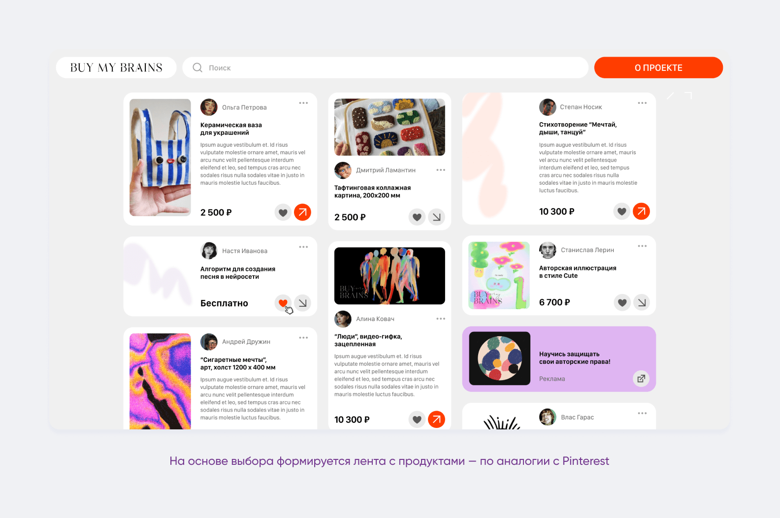 Чтобы продумать пользовательские флоу, мы смотрели на разные маркетплейсы и классифайды: искали лучшие решения и придумывали, как отстроиться. Основной референс — это сайт Pinterest — заказчице нравилось, как здесь реализована лента и личный кабинет, и она хотела сделать в Buy my brains что-то похожее