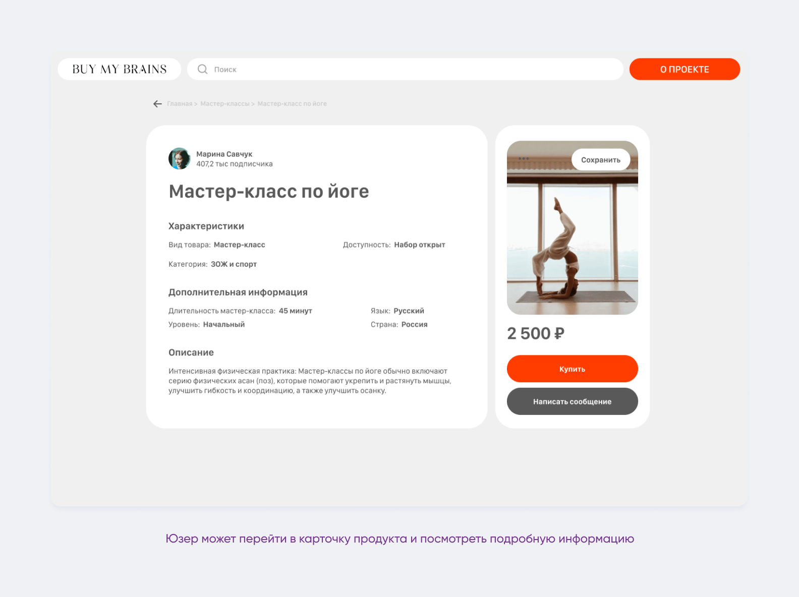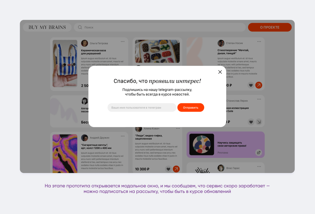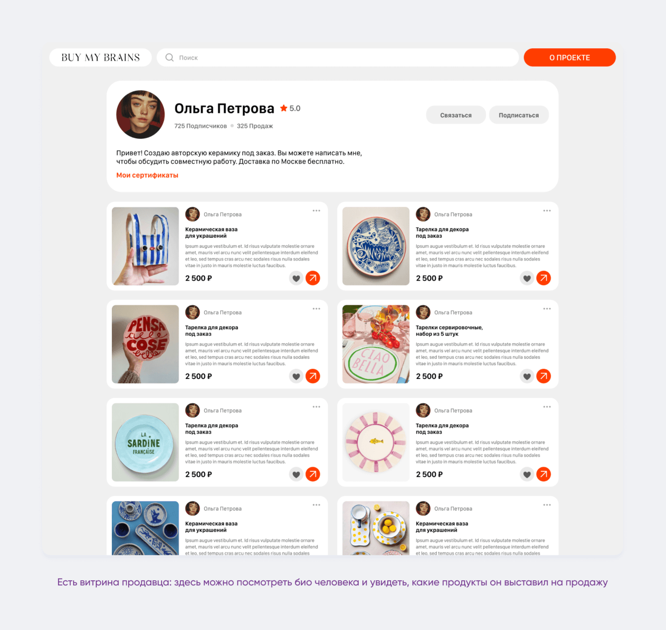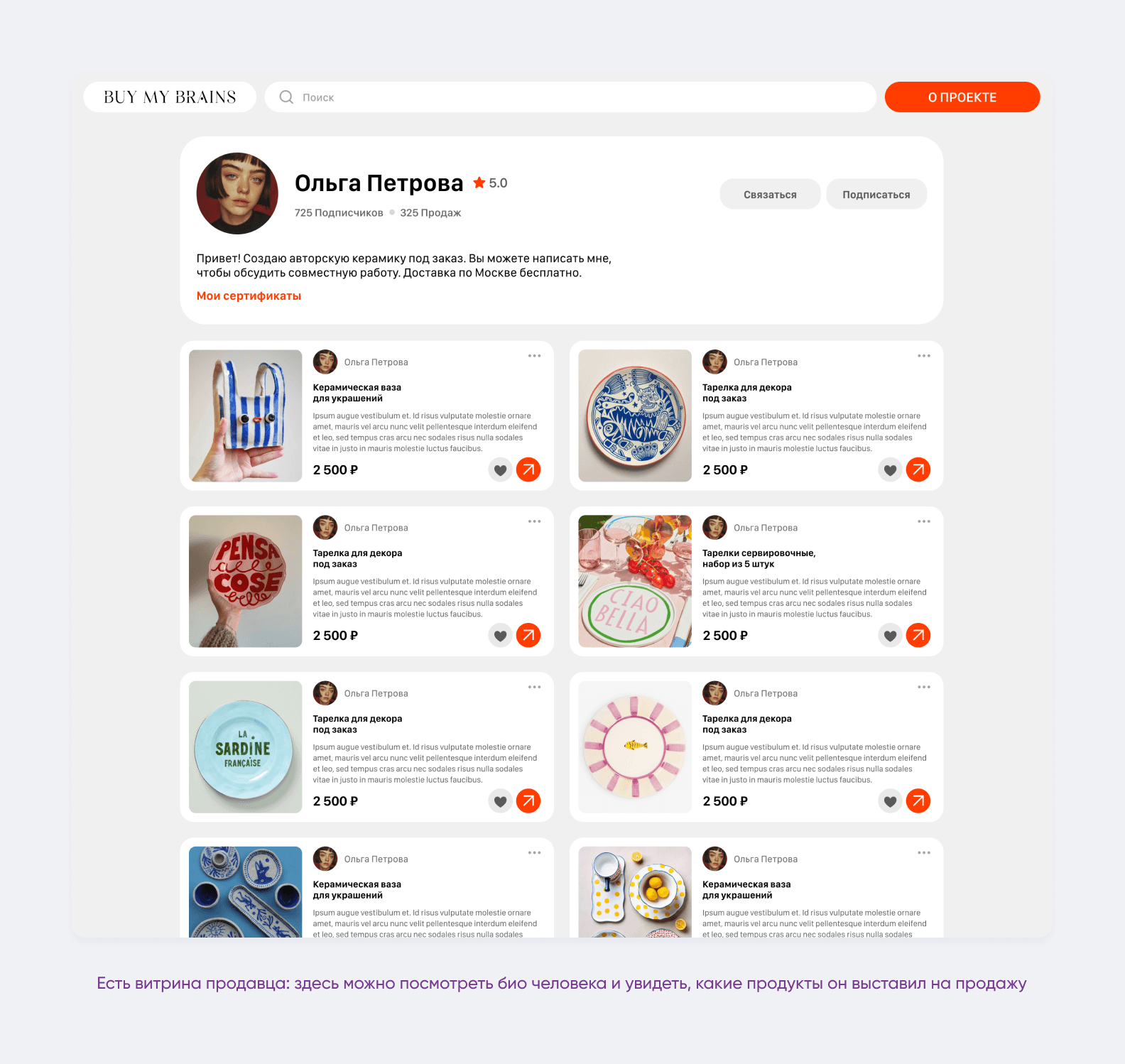 В Buy my brains две взаимозаменяемые роли — покупатель может быть продавцом и наоборот. Мы реализовали главную страницу, ленту и витрину продавца. На этапе прототипа сайта нельзя что-то купить или продать, но можно увидеть, как все будет работать после полноценного запуска маркетплейса.