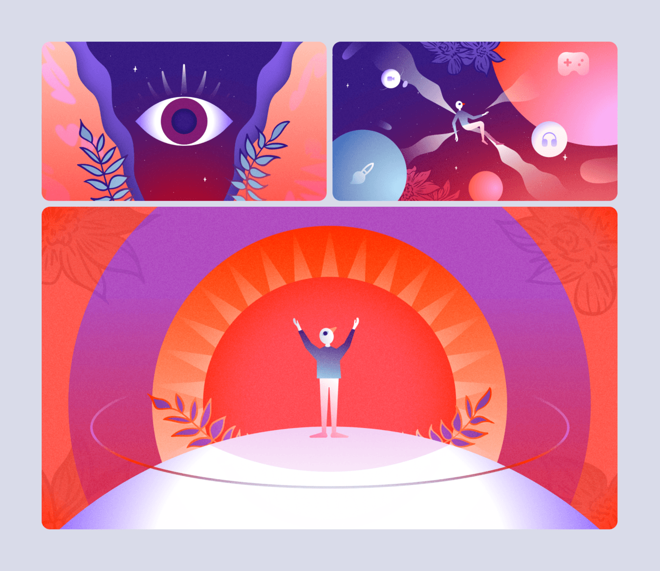 Клиентка выбрала первый вариант — это было именно то, что нужно! Такой яркий и немного броский дизайн способен зацепить аудиторию платформы, которую не так-то просто удивить дизайнерскими креативами. Еще заказчица предложила добавить немного анимации, чтобы нарисованные глаза открывались и закрывались…тут мы поняли, что пора дать полную свободу своему воображению.