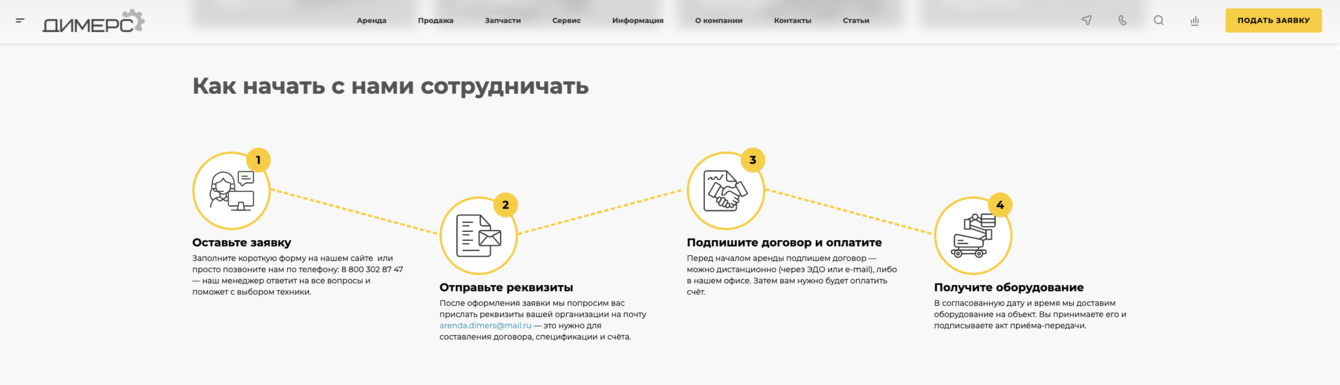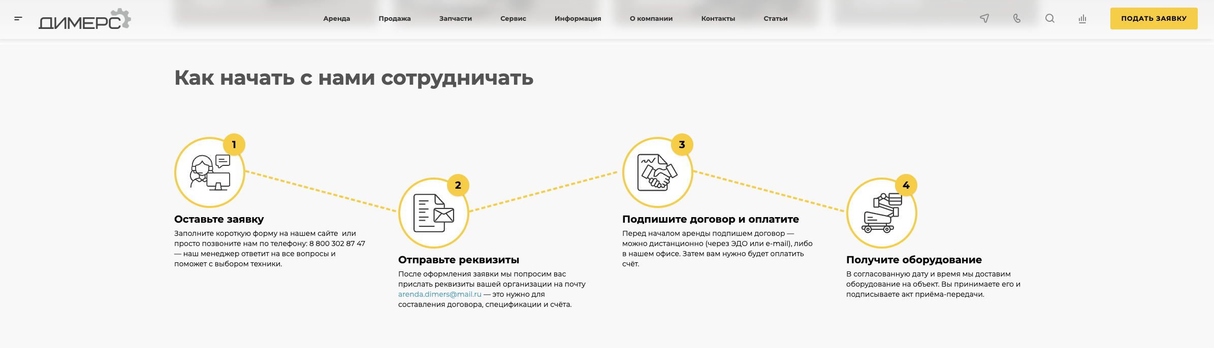 Кроме того, на главной странице сайта мы разместили информацию о шагах, которые необходимо предпринять для сотрудничества с компанией Димерс